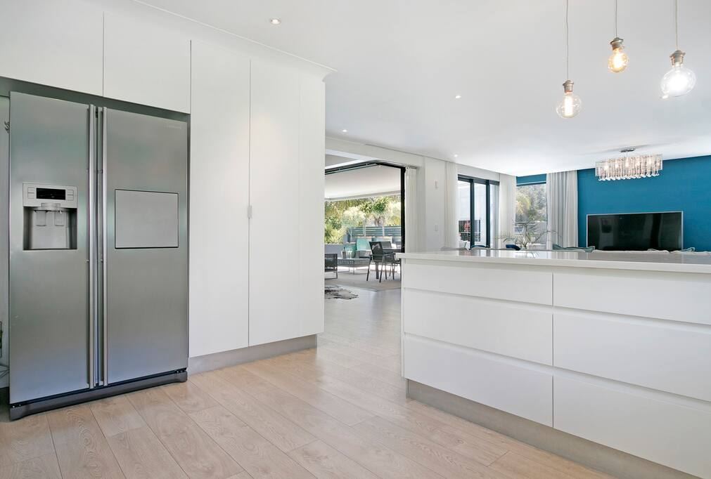 Open-plan kitchen with a private scullery is part of the entertainment area with an easy flow to the dining room and outside pool deck.