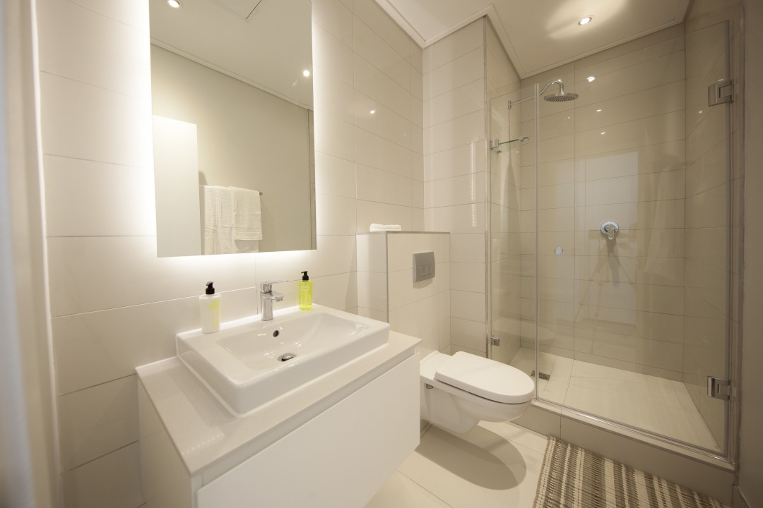 The apartment is surrounded by breath taking views of Cape Town City as well as mountain and ocean views. The main bedroom has a double bed and is en-suite with a shower.