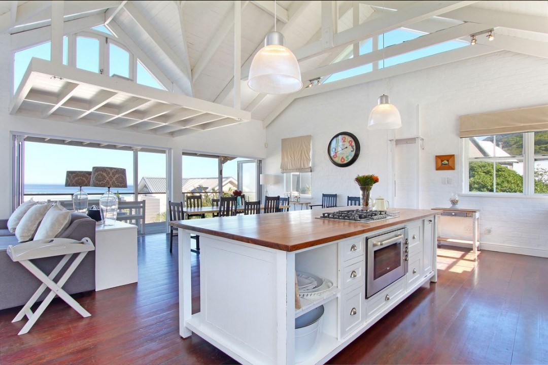 Upstairs large open plan living/dining/kitchen room, sliding doors onto the large balcony, and a double height vaulted ceiling.