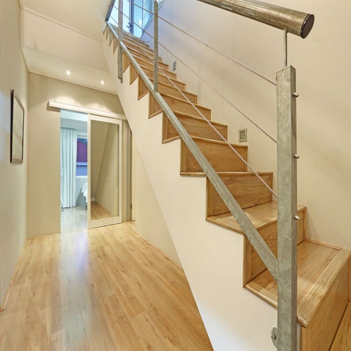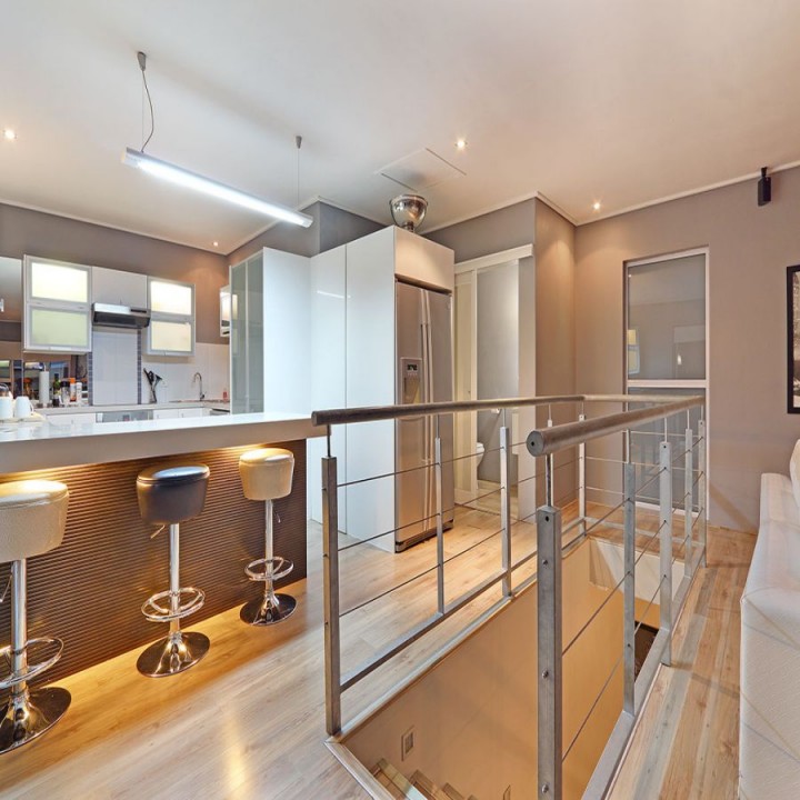 You’ll find yourself drawn to the top floor. The lounge is an inspired use of space, combining expertly designed furniture and crisp modern lines to create an area that’s both chic and comfortable. Large glass window walls open out to views of the city and mountain. Flowing on from the lounge, an open plan kitchen offers all the modern conveniences. Outside is a large deck where you can entertain or simply relax taking in the views of the city and Devil’s Peak.