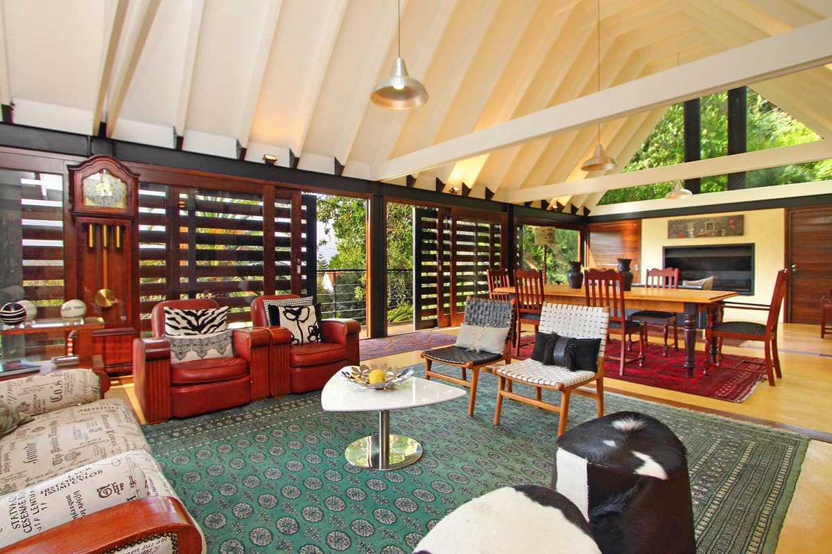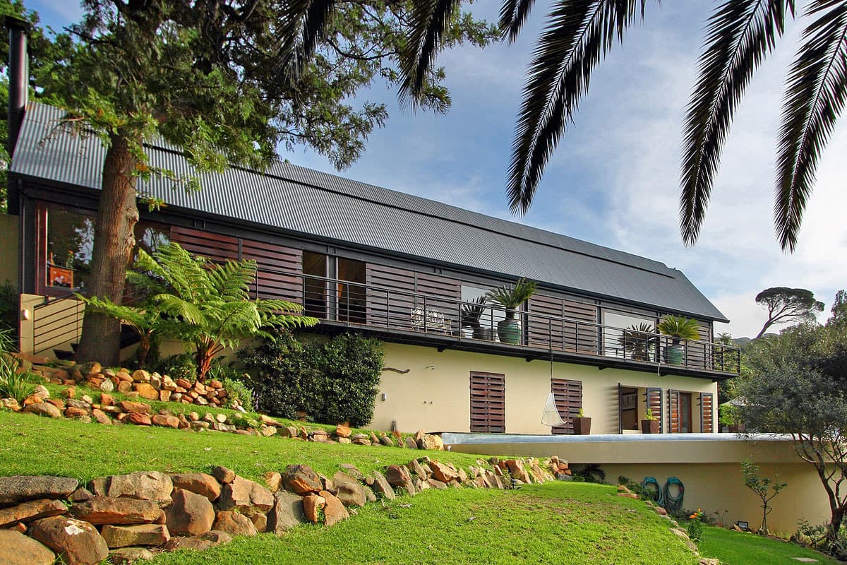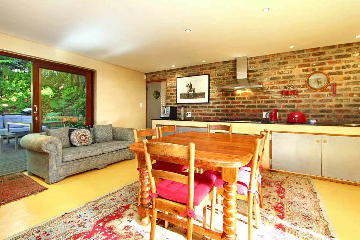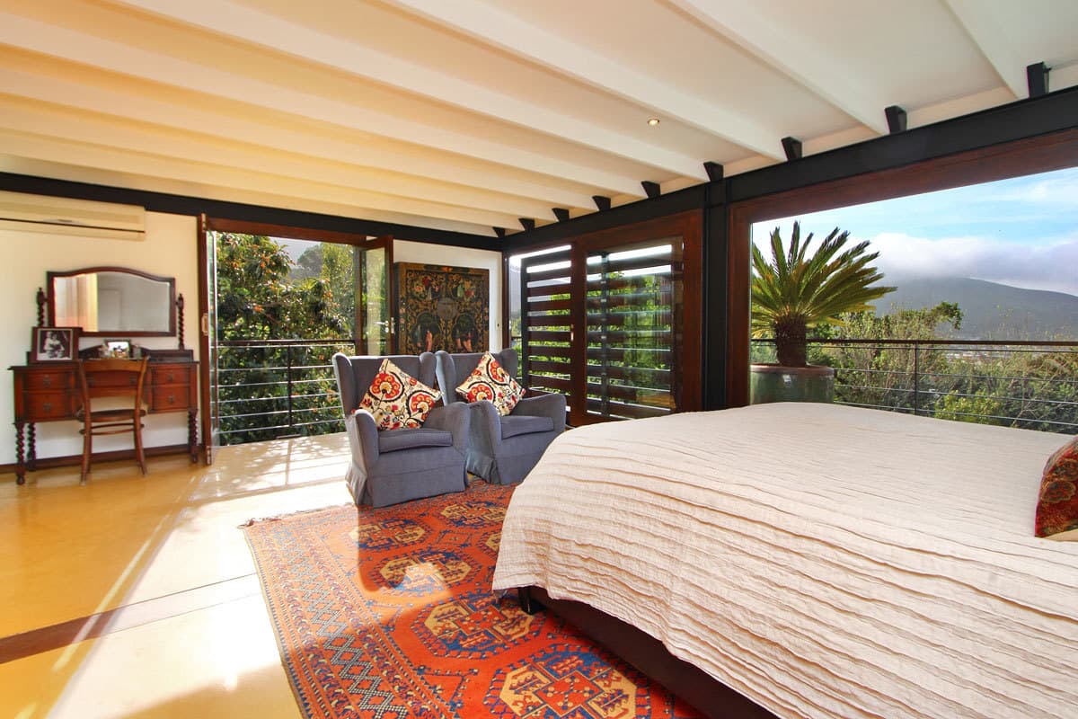 Set at the foot of Table Mountain in a peaceful location close to nature – see owls at night. Central and convenient, just minutes away from the V&A Waterfront, Camps Bay Beach and Table Spacious open plan kitchen – dining – living area with great flow and light and immaculate contemporary finishes throughout the house. The kitchen is fully equipped with modern appliances. The open trussed ceiling and huge glass sliding doors create bright and lofty feel in this beautiful home. Roller shutters extend across the entire length of the house and can be positioned to optimise sunlight throughout the day.
