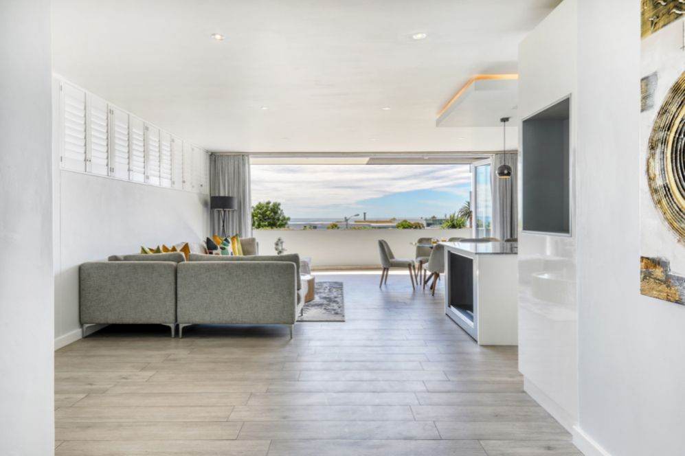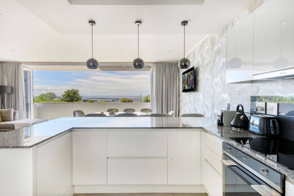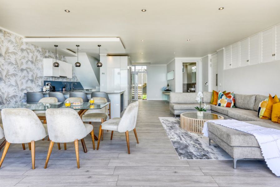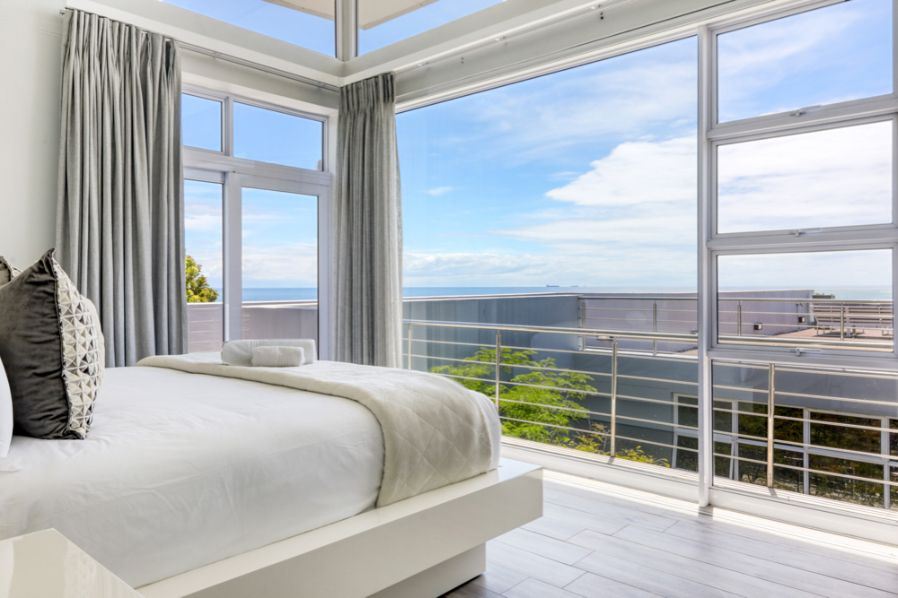 As you enter the property you walk into the open plan living room, dining and kitchen area. This level also offers a guest bathroom. The kitchen has been fully equipped with all you could possibly need for you holiday including dishwasher, washing machine, dryer, microwave. The dining table seats 6 guests. There is also an L-shaped couch and flat screen TV with DSTV access. There is a smaller terrace leading off the living room with views towards the sea.