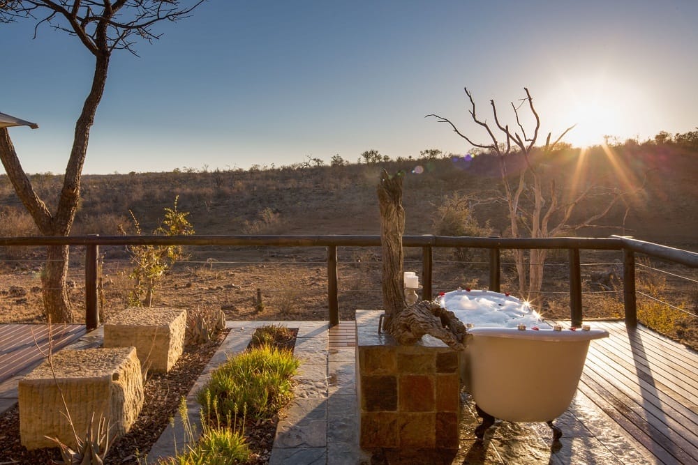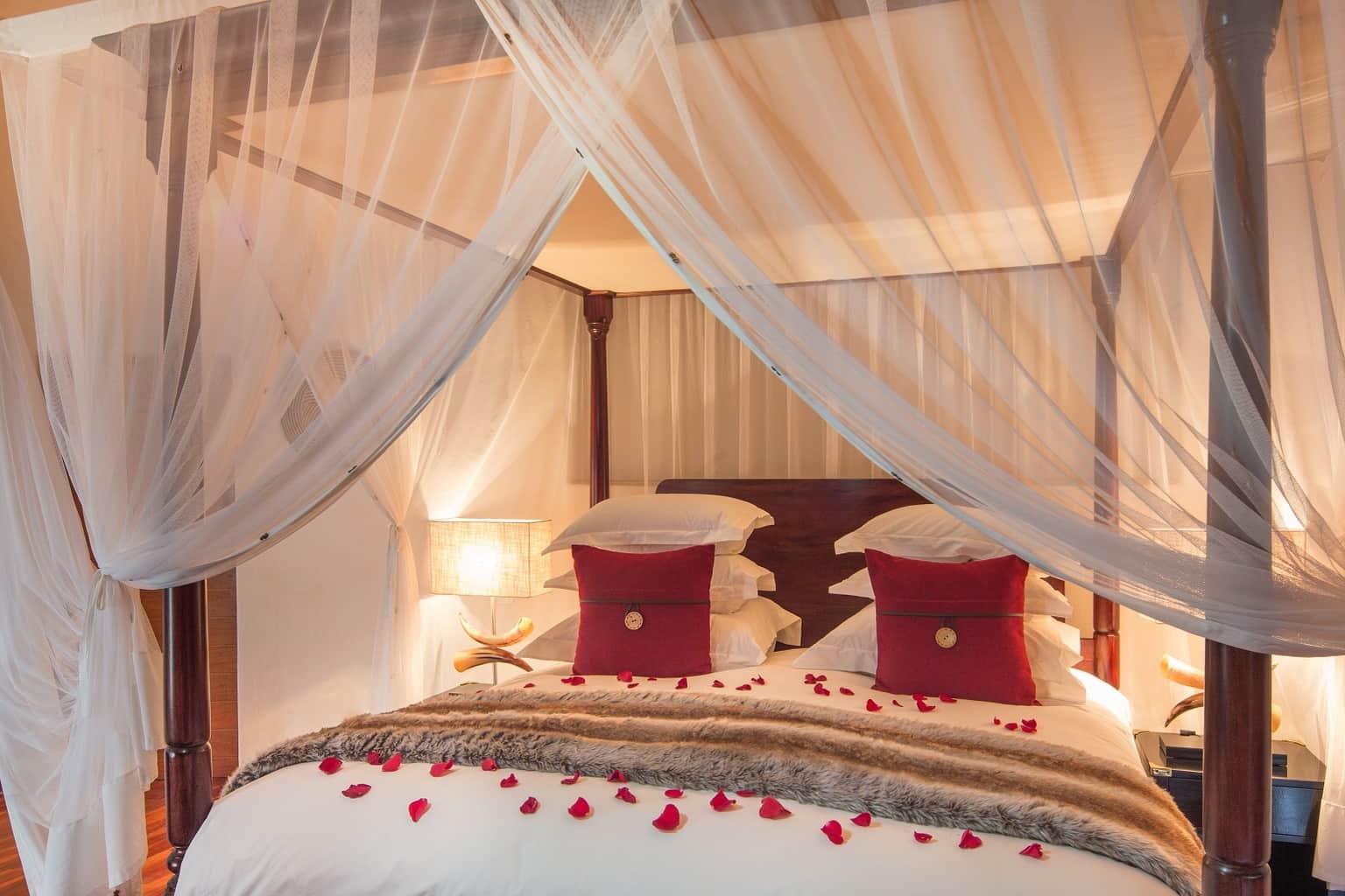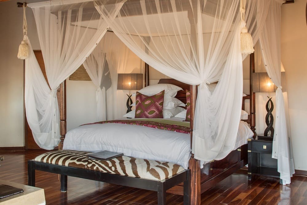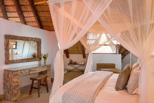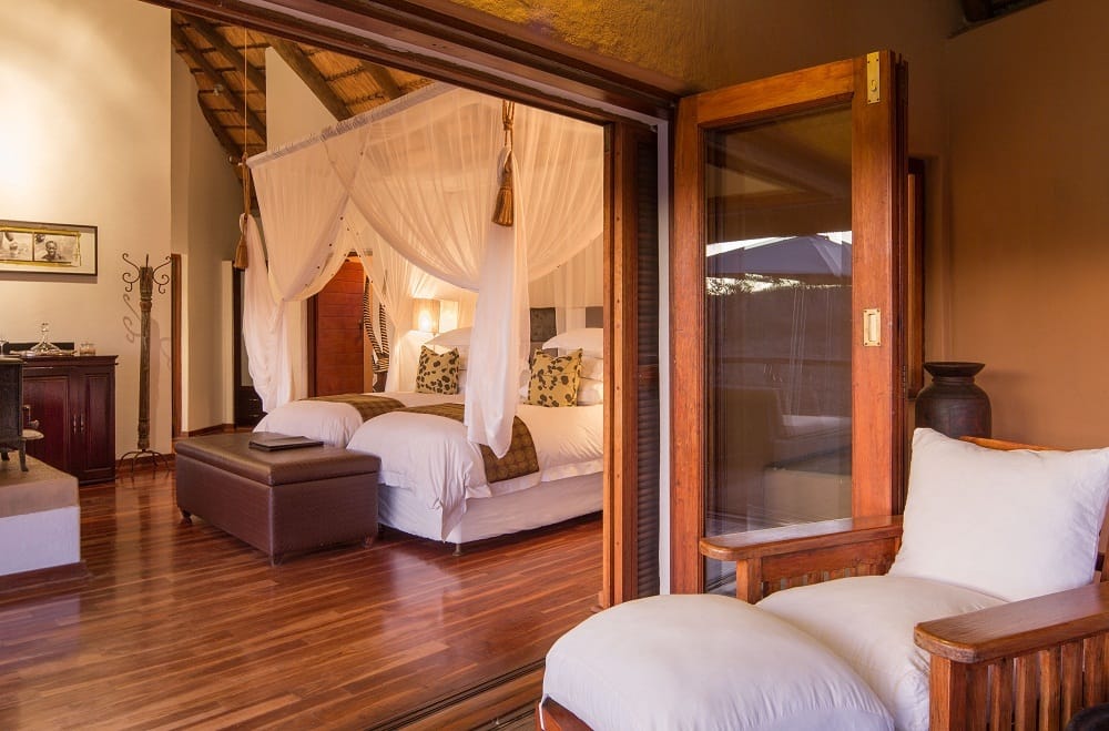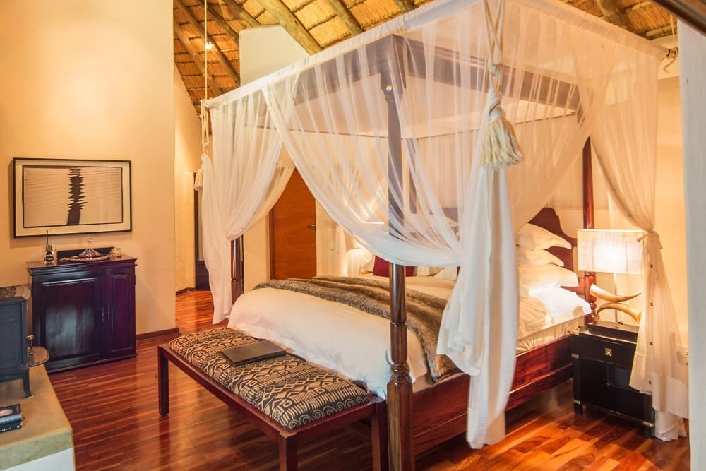 The Honeymoon Suite is embellished in a remarkable four poster bed draped in luxurious percale linen, an adjacent en-suite bathroom with indoor / outdoor rain showers, a romantic bathtub with a beautiful wilderness and waterhole view, a cozy indoor wood fire place and comfortable outdoor seating.