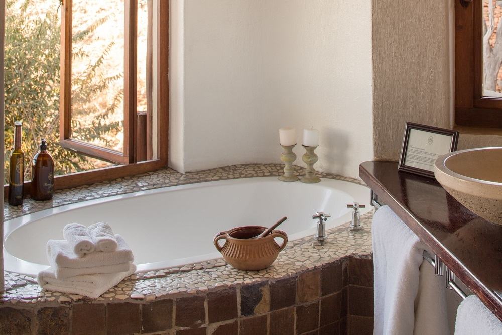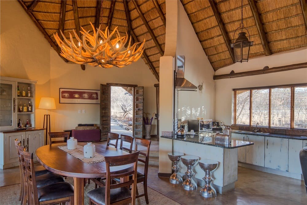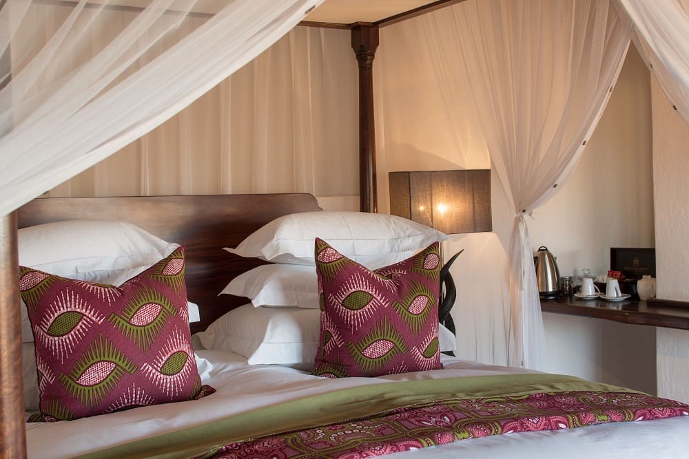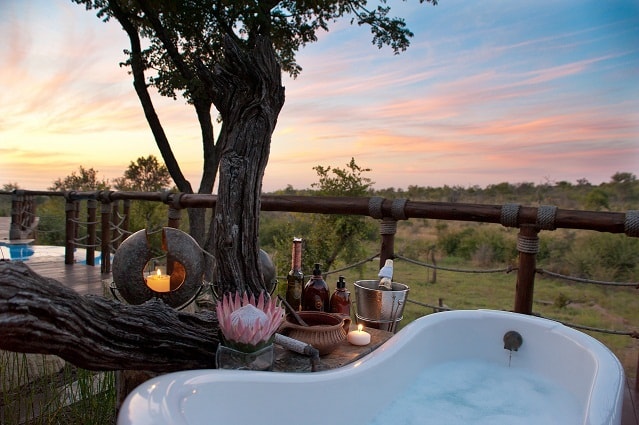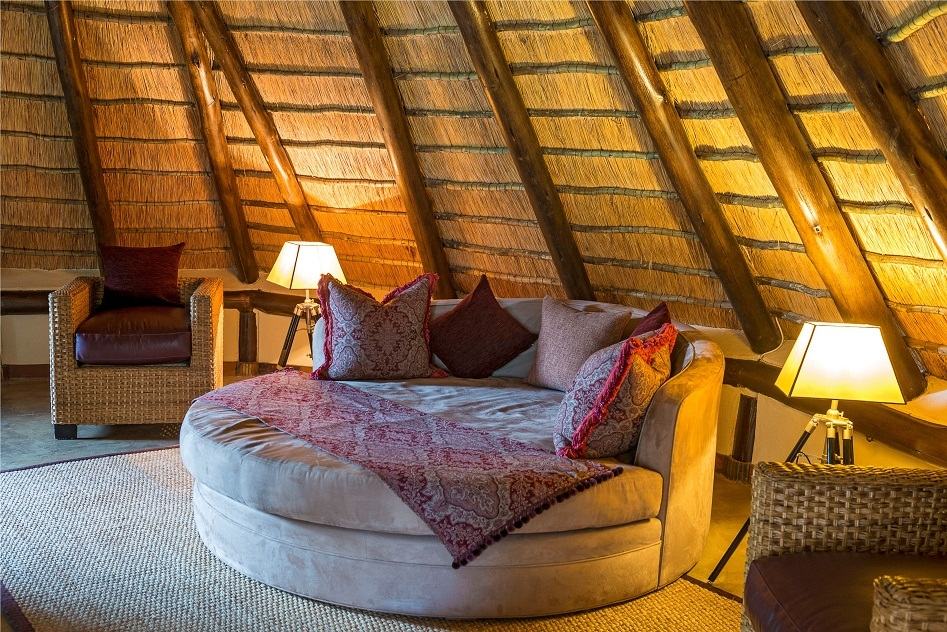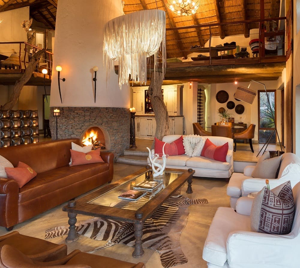The Honeymoon Suite is embellished in a remarkable four poster bed draped in luxurious percale linen, an adjacent en-suite bathroom with indoor / outdoor rain showers, a romantic bathtub with a beautiful wilderness and waterhole view, a cozy indoor wood fire place and comfortable outdoor seating.