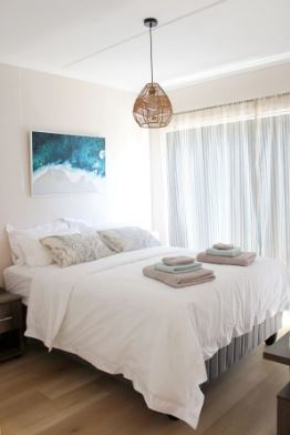 The bedroom has ample cupboard space and a brand new queen sized bed (linen provided).