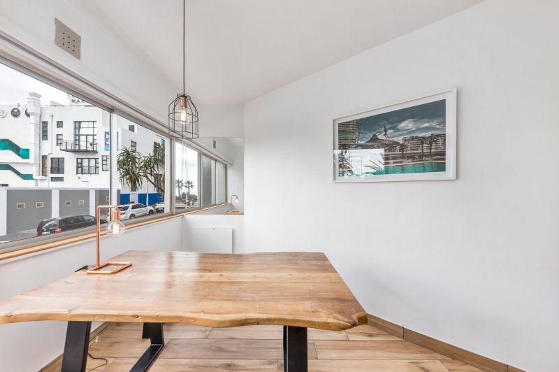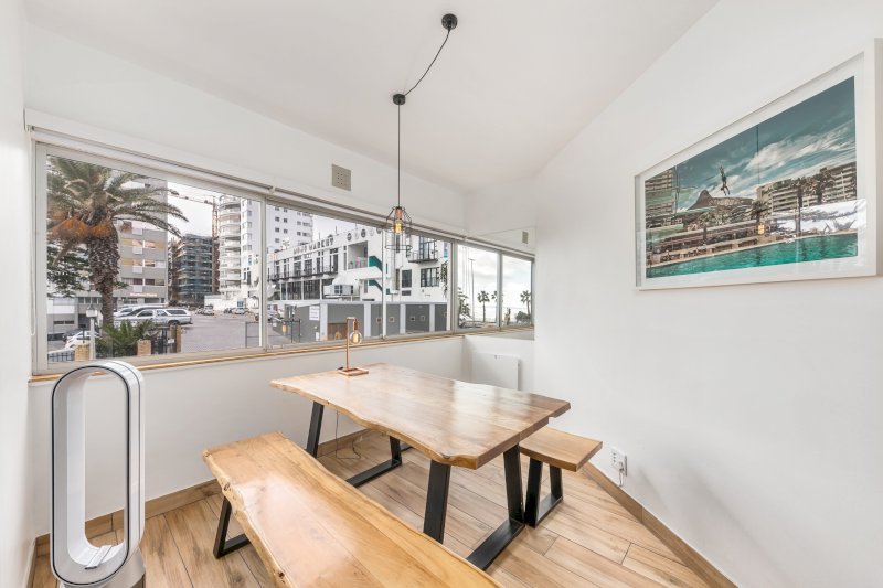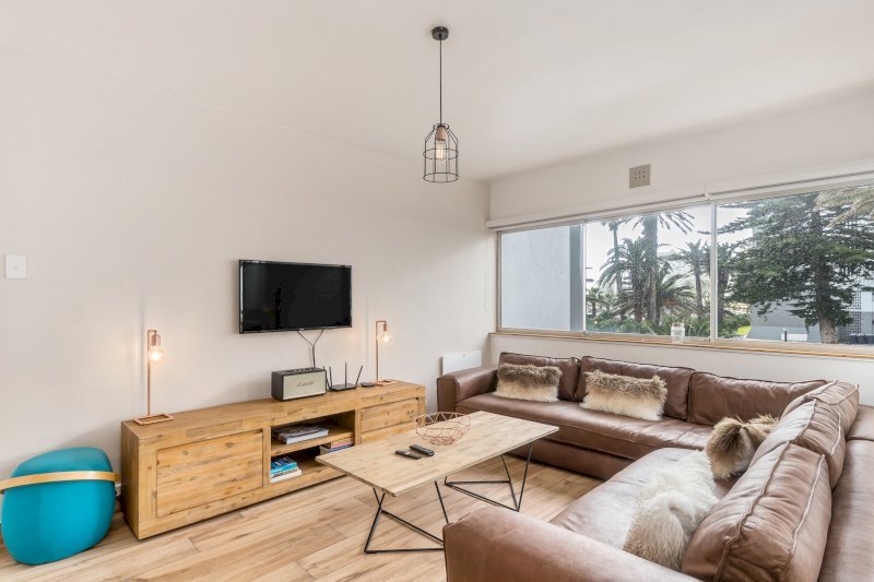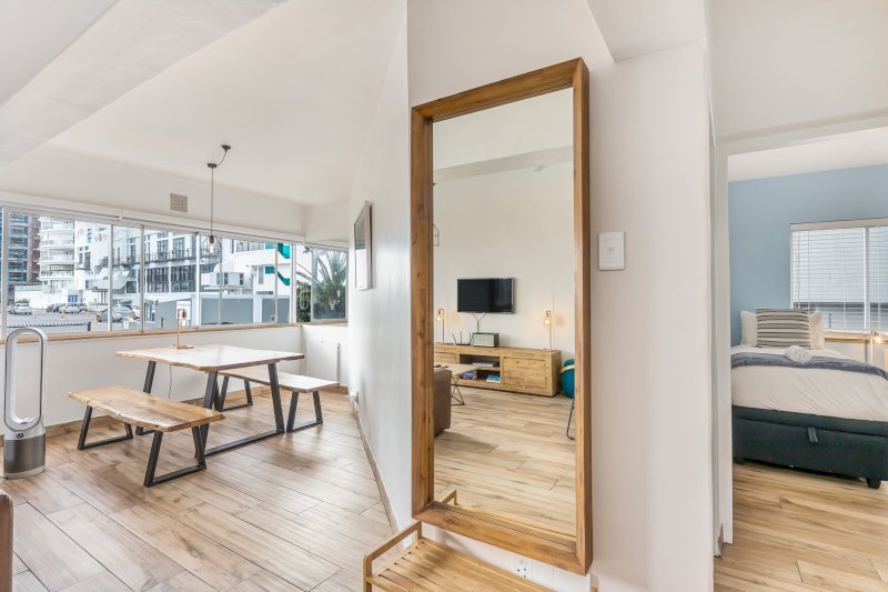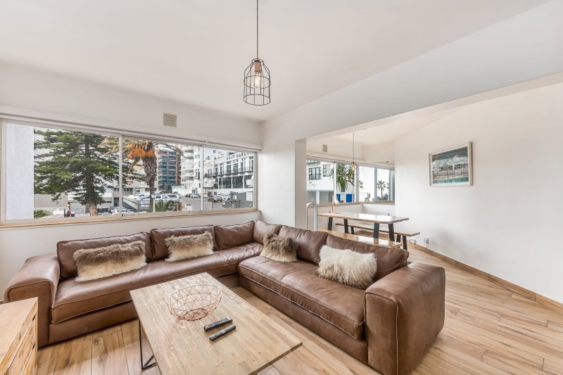 Open-plan lounge and dining area with partial ocean view.