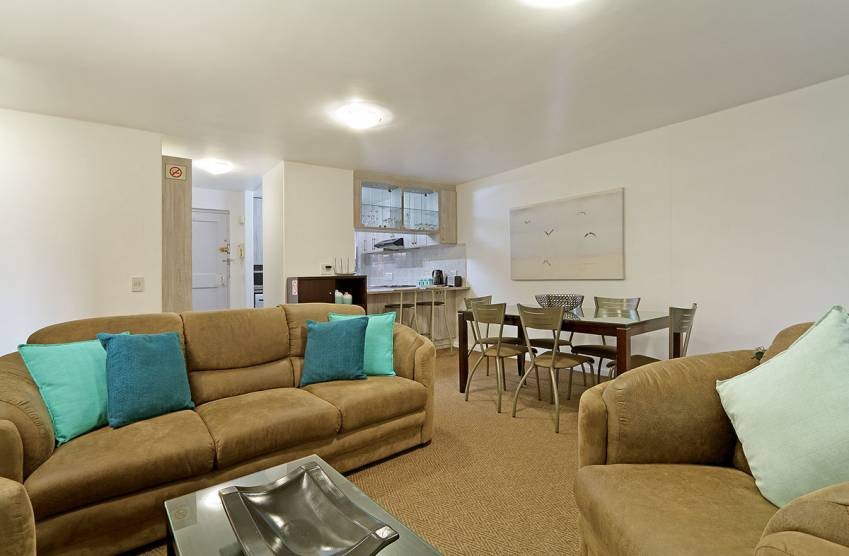 The open plan living area opens up onto the balcony and guests can make use of the fully-equipped kitchen during their stay, which also included a dishwasher and washing machine/dryer combo.