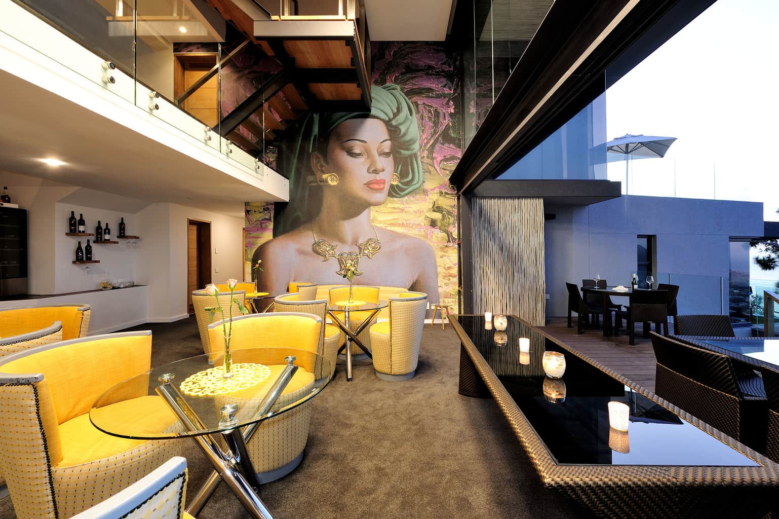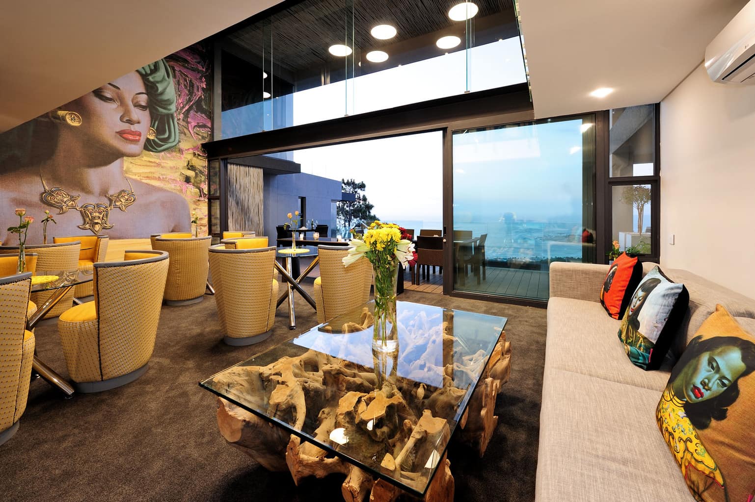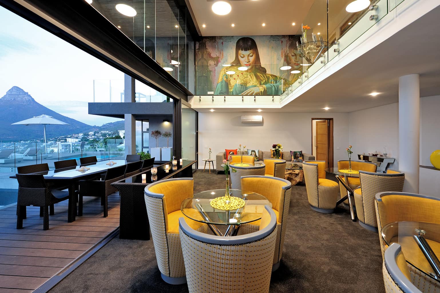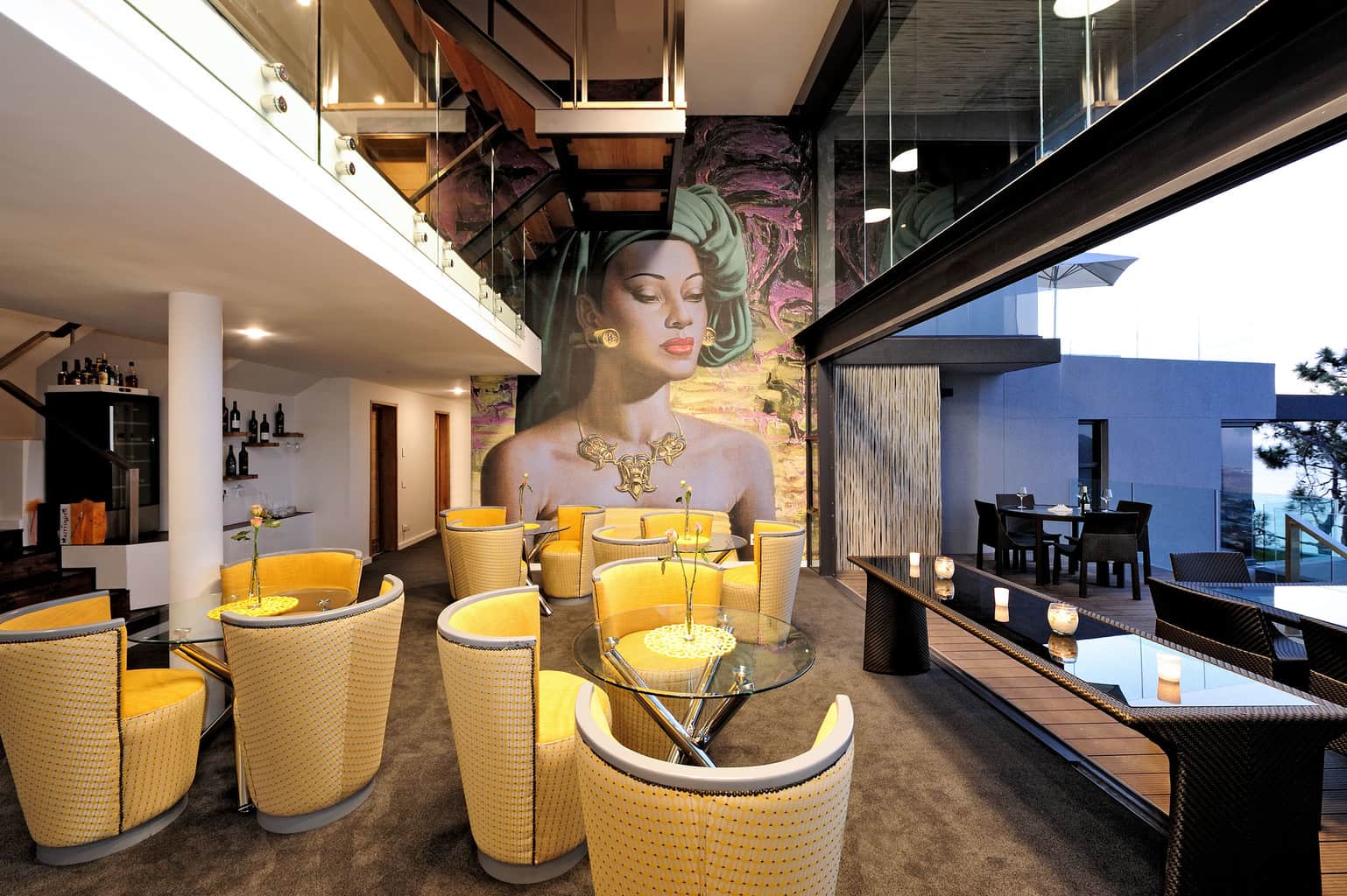 Roche Bobois chairs and enormous Tretchikoff prints complement the spacious interiors. Sit and sip a glass of Sea Star wine (cultivated in Franschhoek) looking over the infinity pool to the sea.