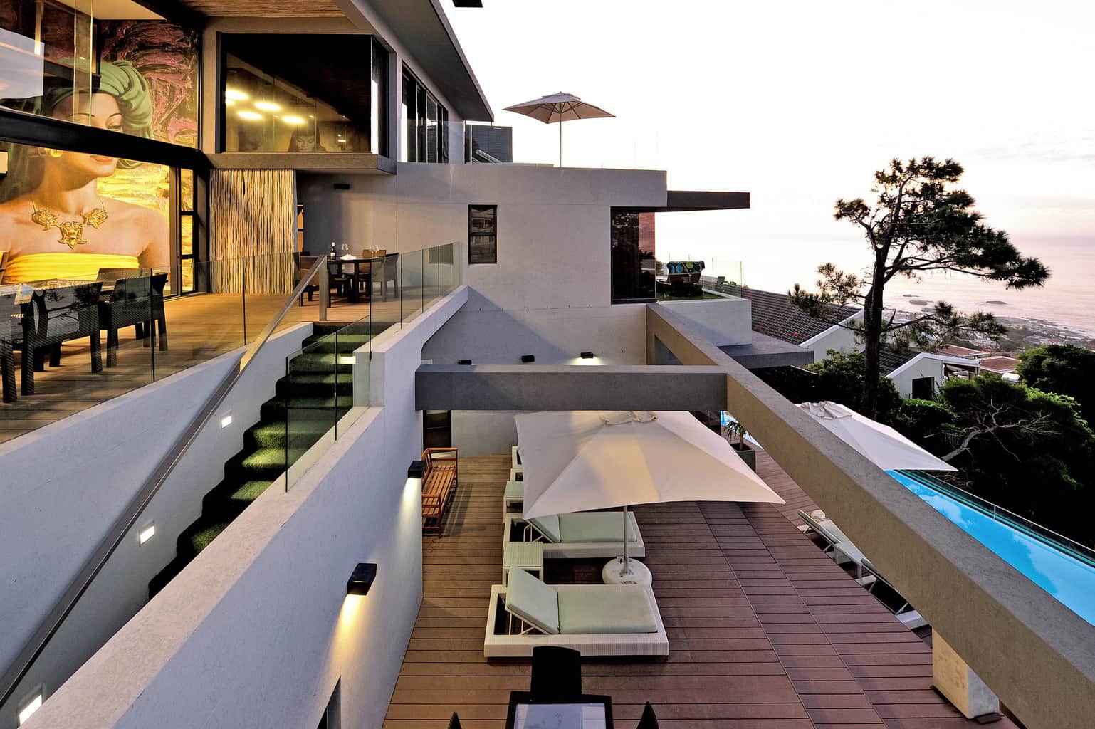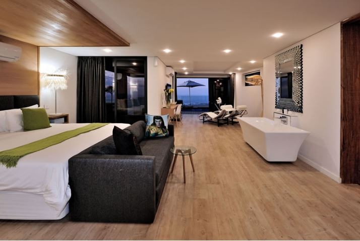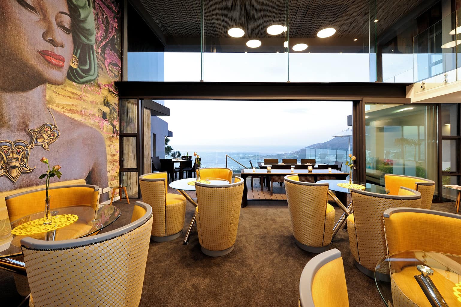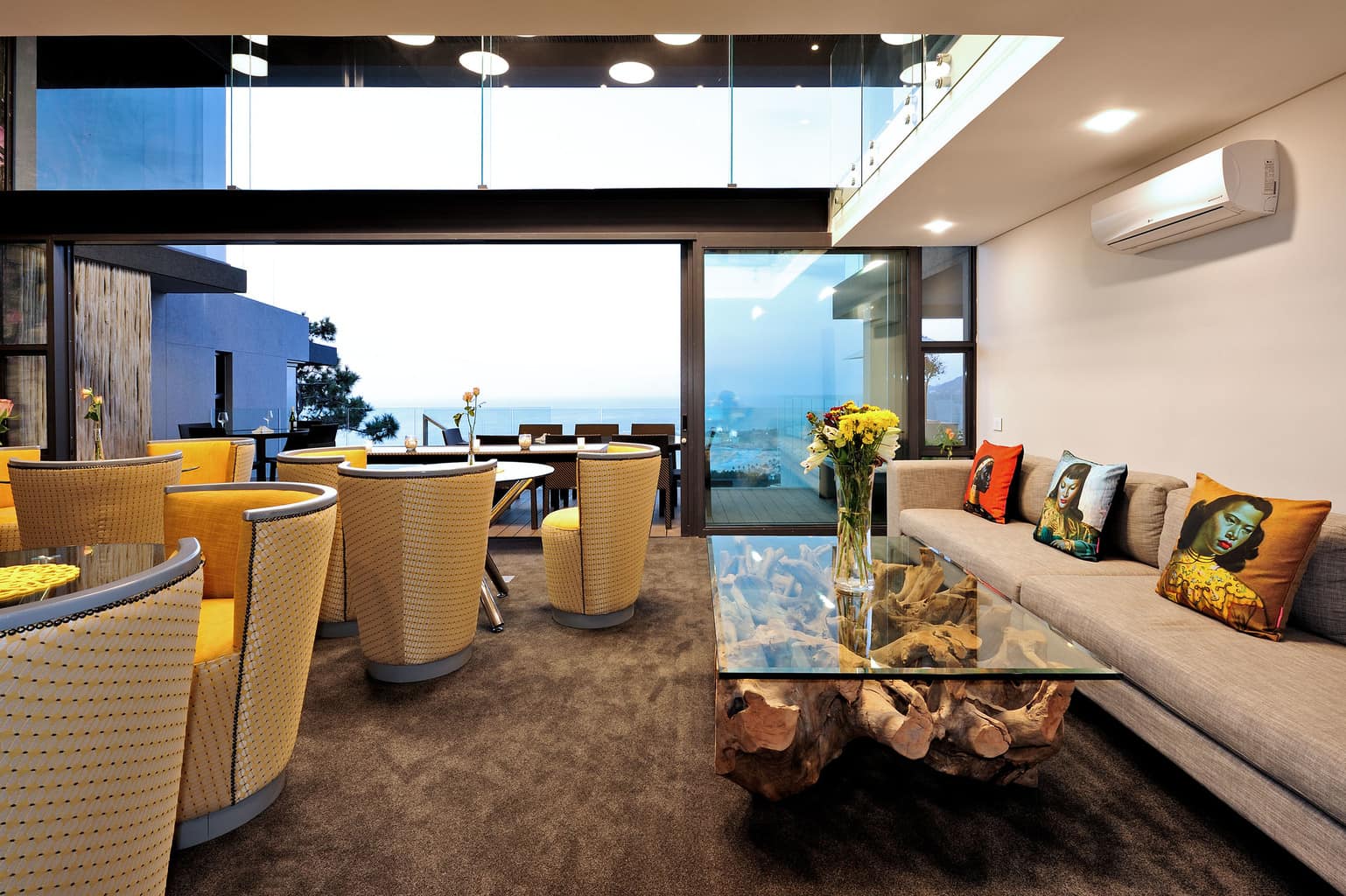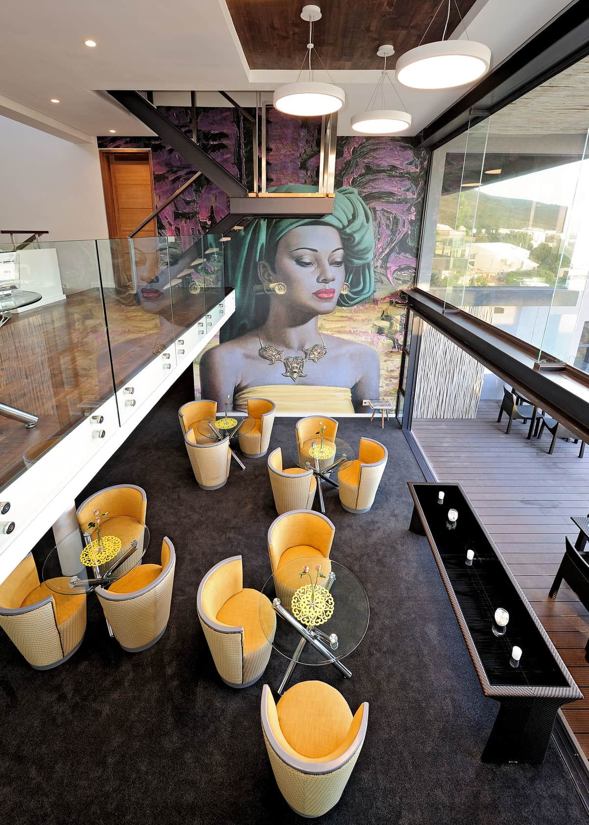 Roche Bobois chairs and enormous Tretchikoff prints complement the spacious interiors. Sit and sip a glass of Sea Star wine (cultivated in Franschhoek) looking over the infinity pool to the sea.