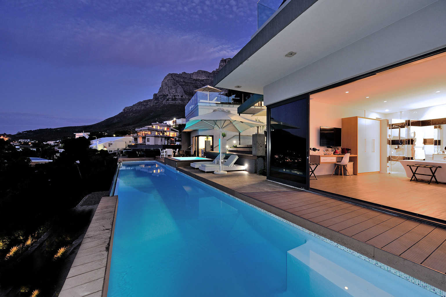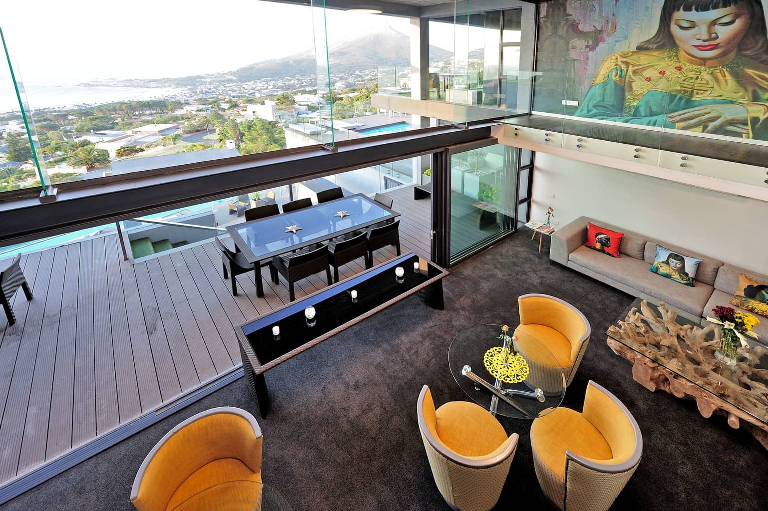 85 sqm Living Room with Ligne Roset couch, open fire place, Yamaha grand piano, designer kitchen, the best view over Camps Bay, 23 meter sea facing balcony and 15 sqm mountain view terrace with fantastic views of Table Mountain and 12 Apostles.
