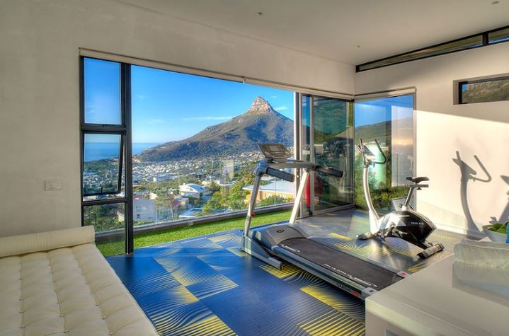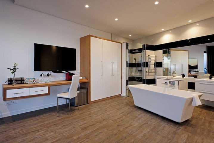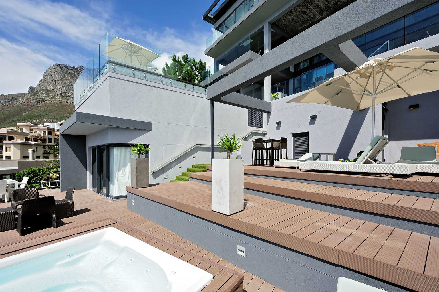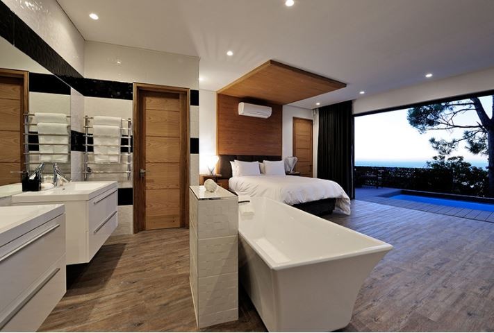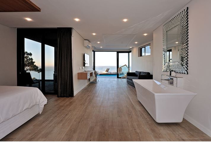 60 sqm Master bedroom with a Jacuzzi bathtub for two with the best view over Camps Bay beach, the Atlantic Ocean and Lions Hill, a HansGrohe shower temple, 2 basins and extra toilet. Modern Couch (tv lift with a 55inch 3D smart tv in the backrest of the couch – invisible – comes out of the couch via remote) The couch is also convertible into a sleeper couch.
