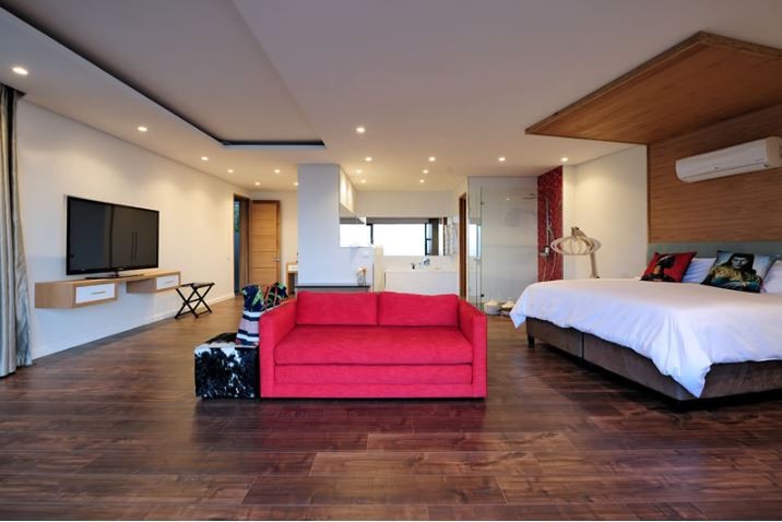 A comfortable king size bed (extra length), two lounge chairs with a coffee table, an executive desk and a 60” Full HD LED screen with blu ray player and satellite TV complete your comfort zone. The variety of 16 different coffees and teas, your Nespresso cappuccino machine and the content of your stylish mini bar will come as a delight for your taste buds. A comfortable couche can be turned into an extra bed. Your spacious private terrace with your loungers will make your stay an unforgettable holiday at Sea Star Rocks.