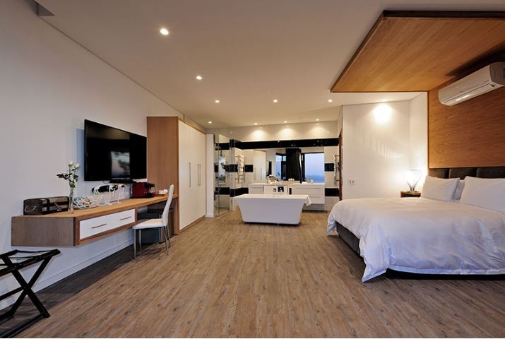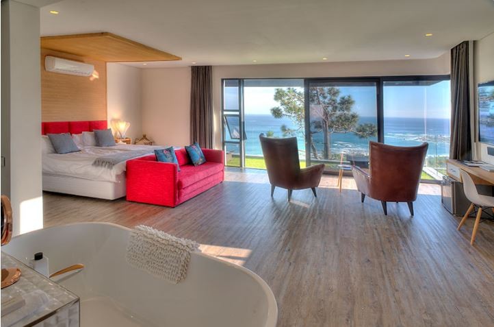 Our Pool Room is unique in being situated next to our state-of-the-art swimming pool (length: 18 meter) and the Sea Star Rocks Jacuzzi overlooking Camps Bay, the beach and Lions Head. Guests can enjoy the amazing 180 degree sea view from their 30 square meter room and their private terrace. The Pool Room itself is cosy with a King-size bed (extra length) as well as the freestanding bathtub with shower and heated towel rails. The room features a 50’’ LCD screen with Blu Ray DVD player and satellite TV and a desk with chair as well as a Nespresso coffee machine and mini bar.