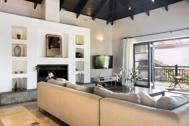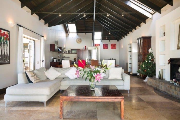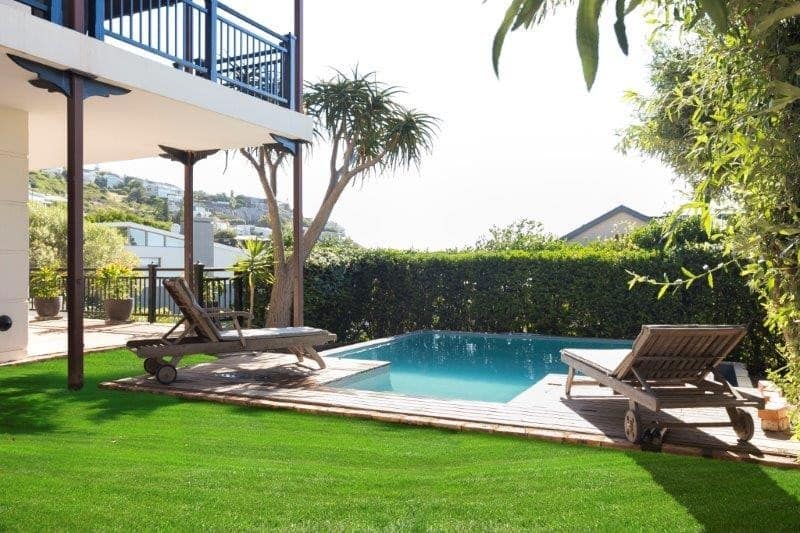 Balinese styled double storey home one road up from the magnificent, Blue Flag Status, Llandudno Beach. The ground floor comprises of a playroom, informal lounge, patio leading to small splash pool. There are three double bedrooms downstairs, one of them is en-suite, and there is an additional family bathroom, laundry and guest loo on this level. There is a lovely side patio which the bedrooms lead out onto.