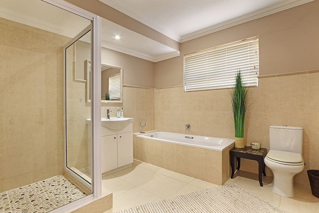 This modern home within a secure estate is made up of 3 bedrooms, the bedrooms include a king size, queen size and 2 x 3/4 beds. The main bedroom has an en-suite bathroom with a separate bath and shower while there are 2 x guest bathrooms to use.