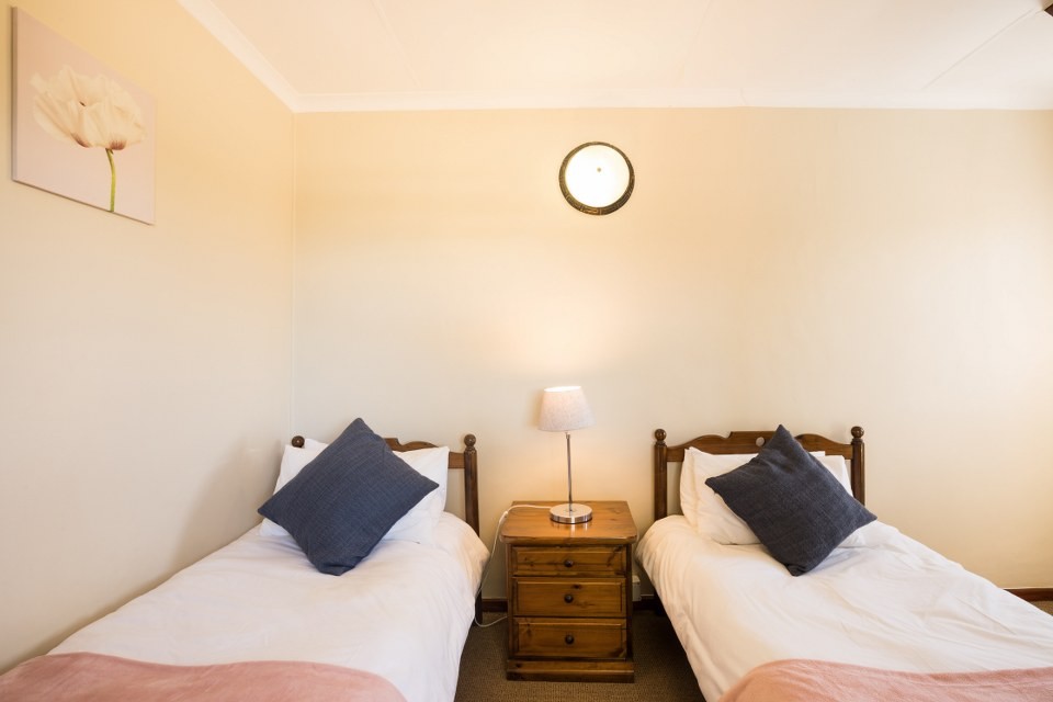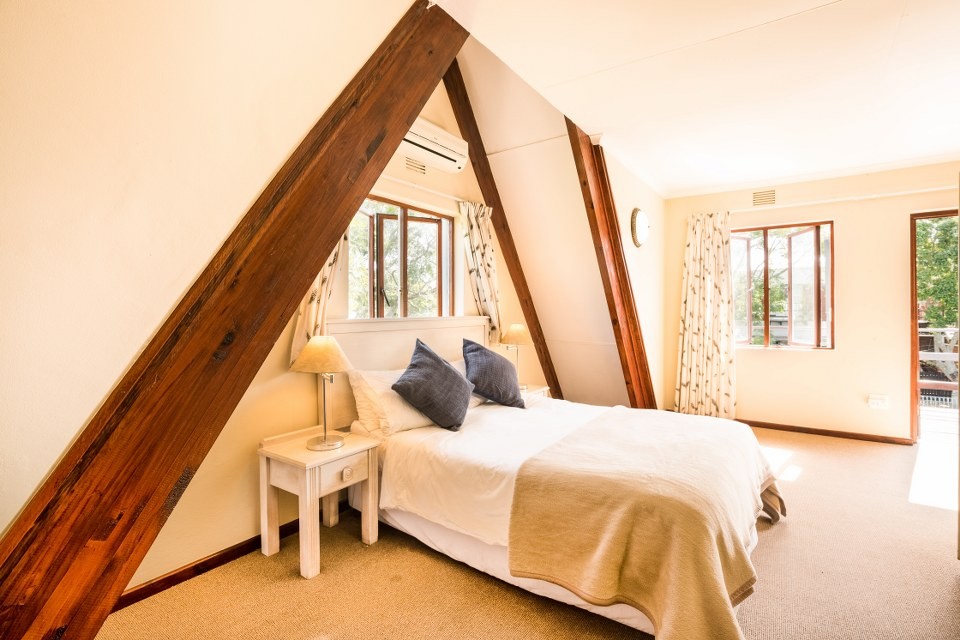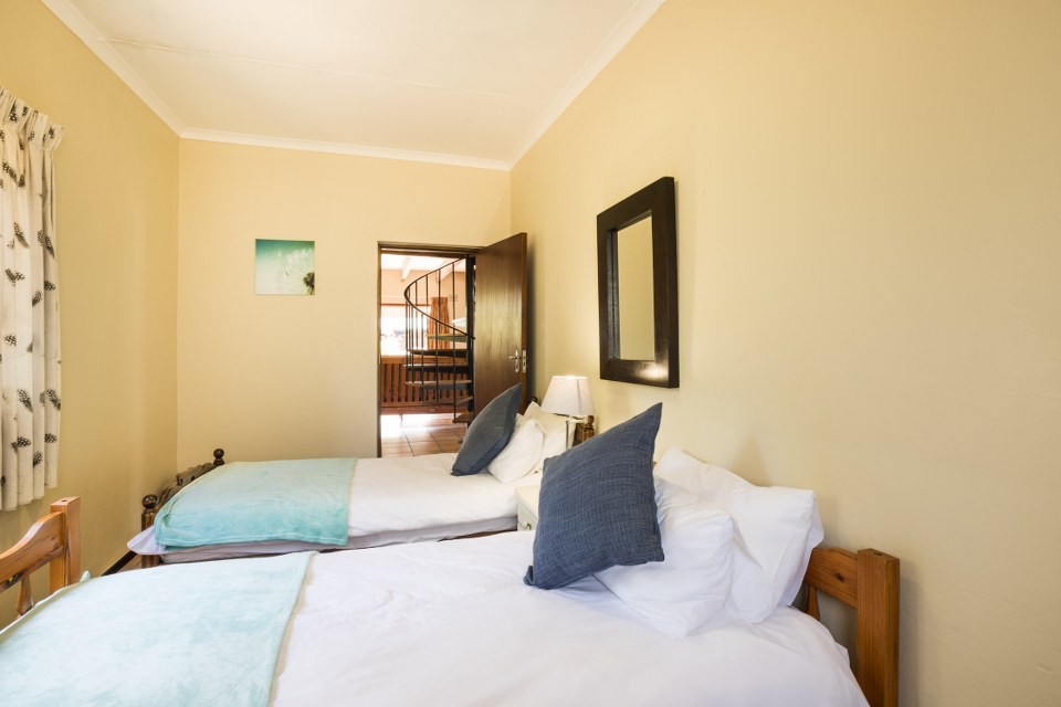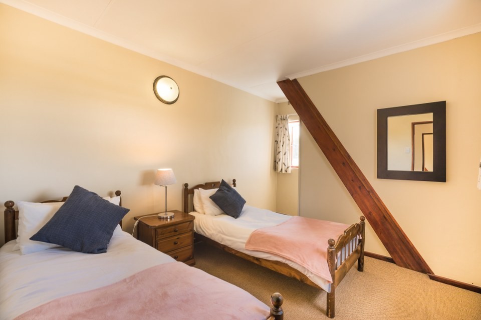 This double-storey Garden Route Family & Pet-Friendly Holiday Home offers four bedrooms sleeping up to 8 people comfortably. Upstairs are three rooms and separate bathroom; downstairs is the fourth room, en-suite with additional, separate bathroom.