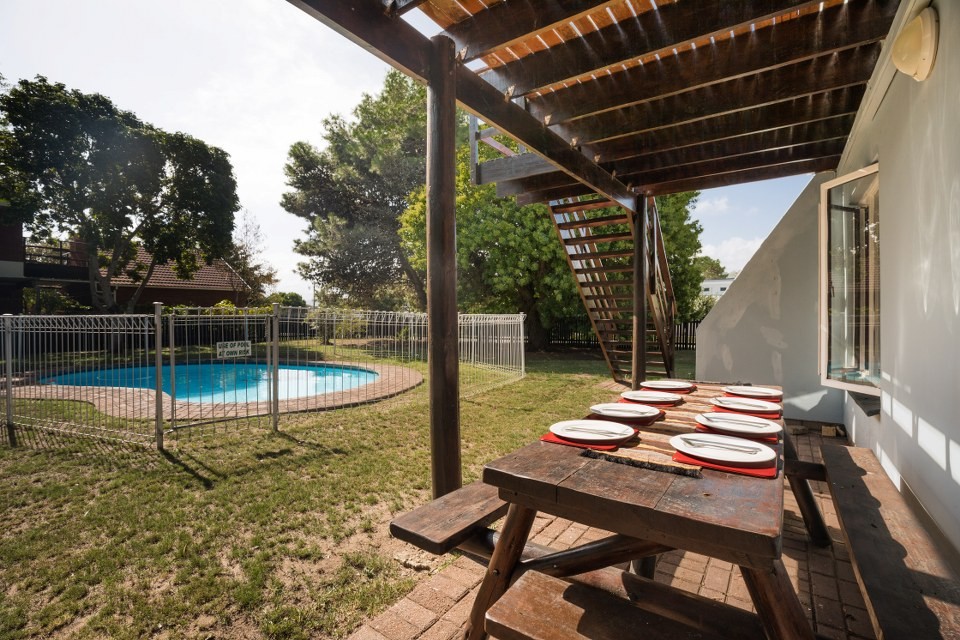 Outside – Undercover patio with 8-seater dining table. Built-in braai with 4-seater table. Swimming pool (fenced in). Fully enclosed and very spacious garden. Undercover parking and ample additional parking on-site.