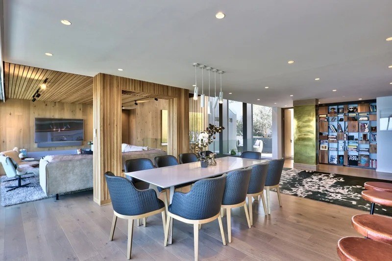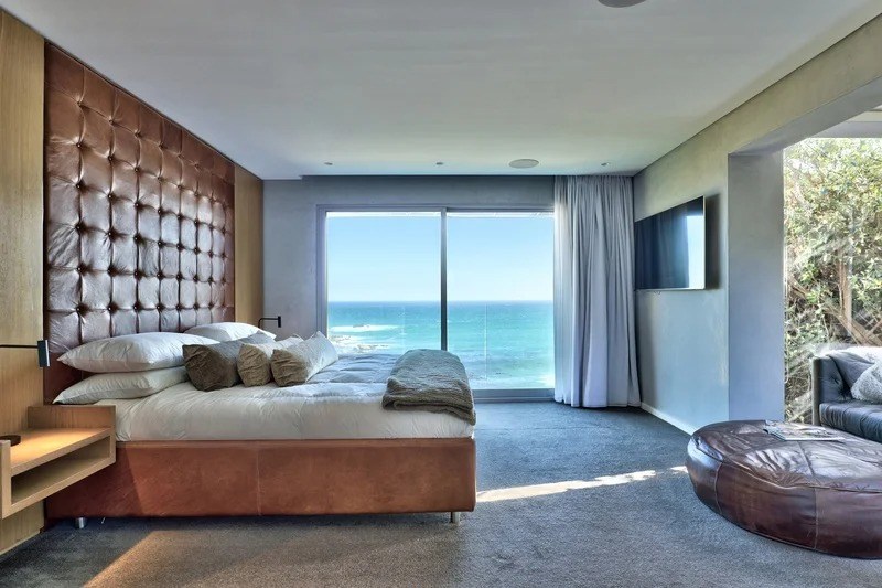 It’s joined by a large, lavish entertainment space where an open gas fireplace discreetly divides the long, black granite table and bar area from the lounge and flat-screen TV. The 6-seater built-in bar, with its speckled gold and black marble countertop, exudes a sultry style and entices you to perch yourself next to it, as you enjoy watching the sunset right in front of you.