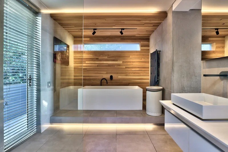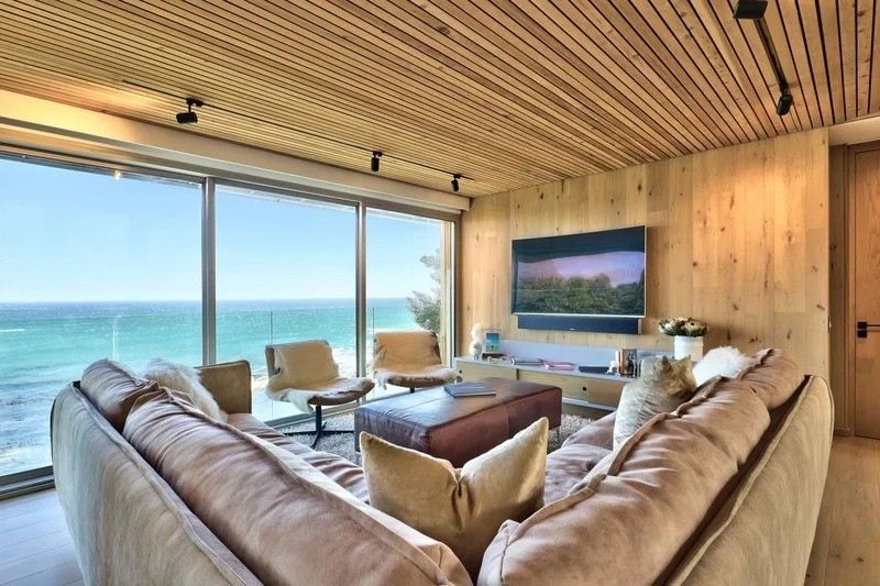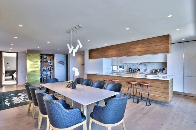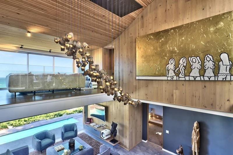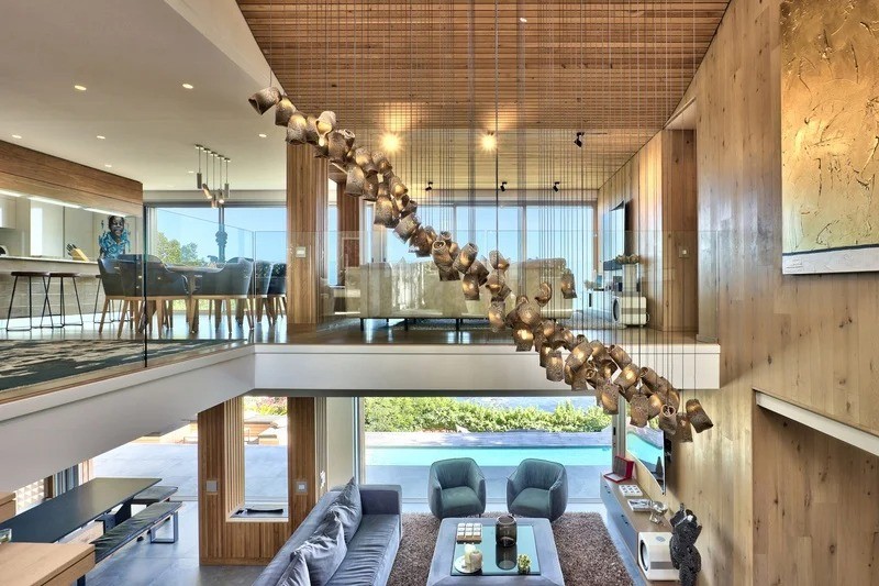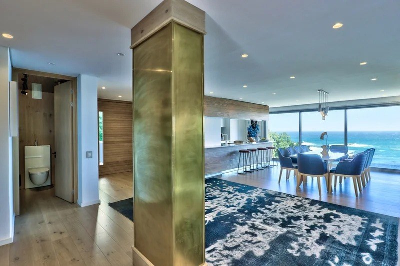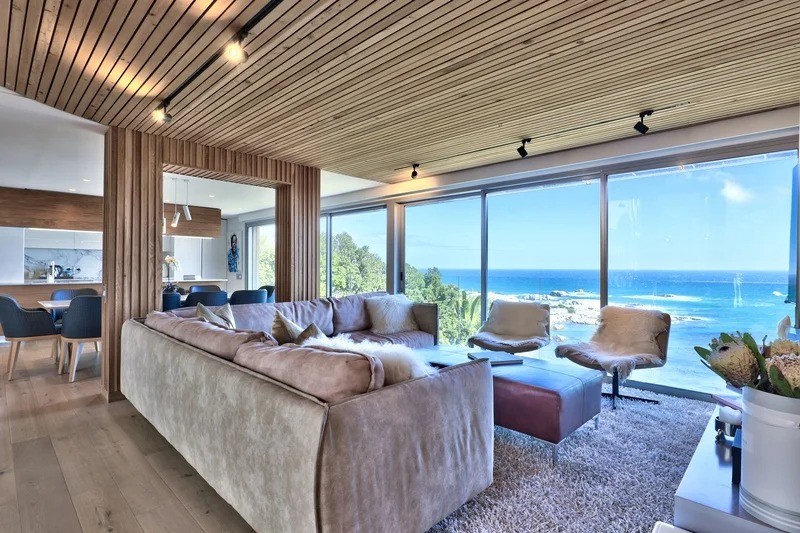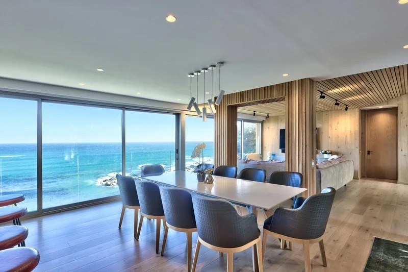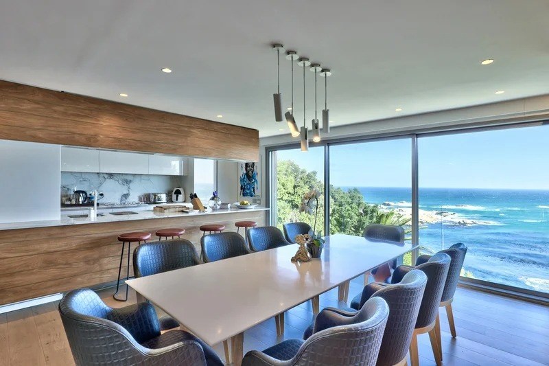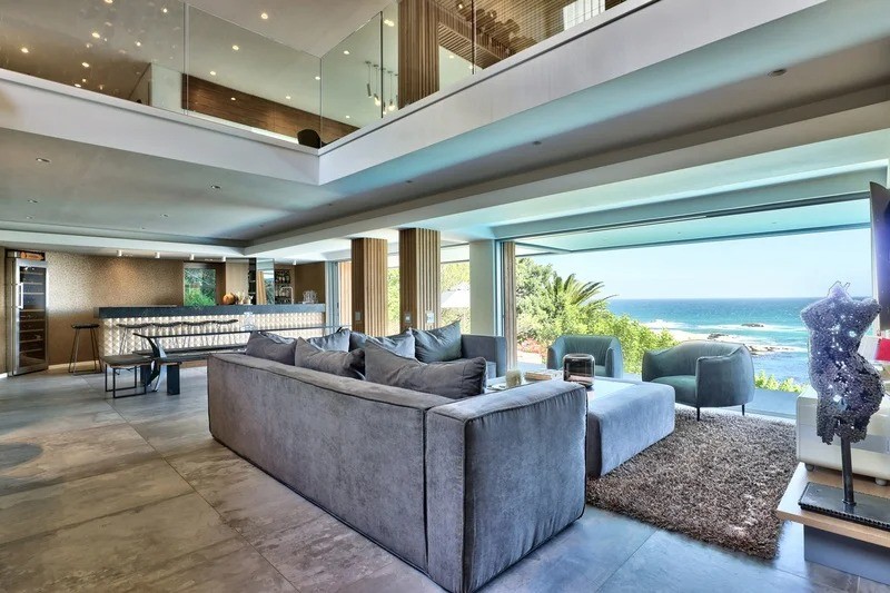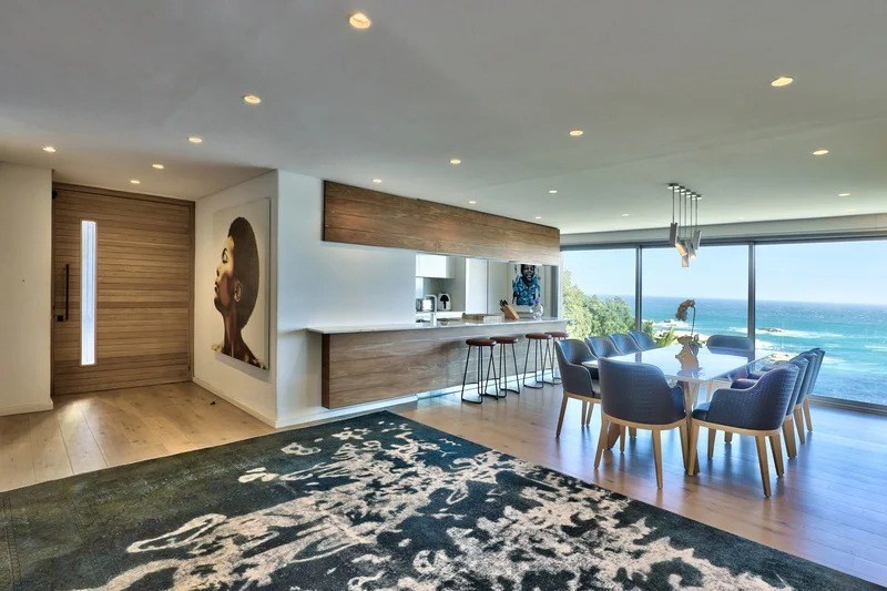 Saddled upon the lower cliffs of Camps Bay, this state-of-the-art, contemporary villa tiers over two levels, and hovers above the glistening Atlantic Ocean. A bold blend of concrete and timber elegantly frames the facade and continues inside as you enter through the sturdy wooden door, and into the villa.
