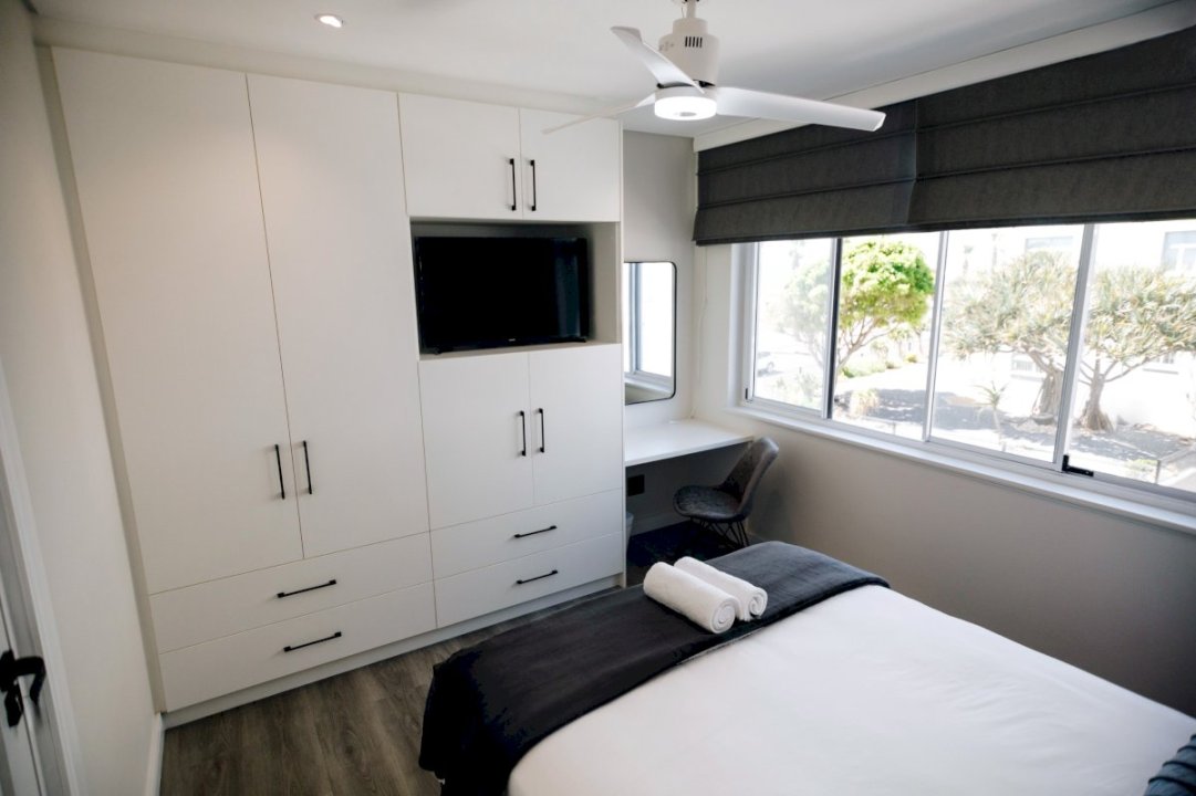 The second bedroom features two three quarters and the third bedroom an Extra-Length Queen bed. They share a separate bathroom with a walk-in shower. Each bedroom has it’s own Smart TV.