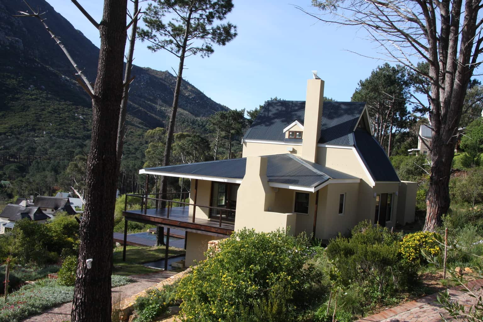 Cape Cedar- Mountain and Vineyard facing, 2 Bedrooms en suite with Mezzanine sleeping 2 guests. Light and airy Lodge with lovely Kitchen and Dining Room. The Living Room is on a lower level with Fireplace and large outdoor Verandah. Separate Barbecue and undercover parking for one motor car. Sleeps 6.