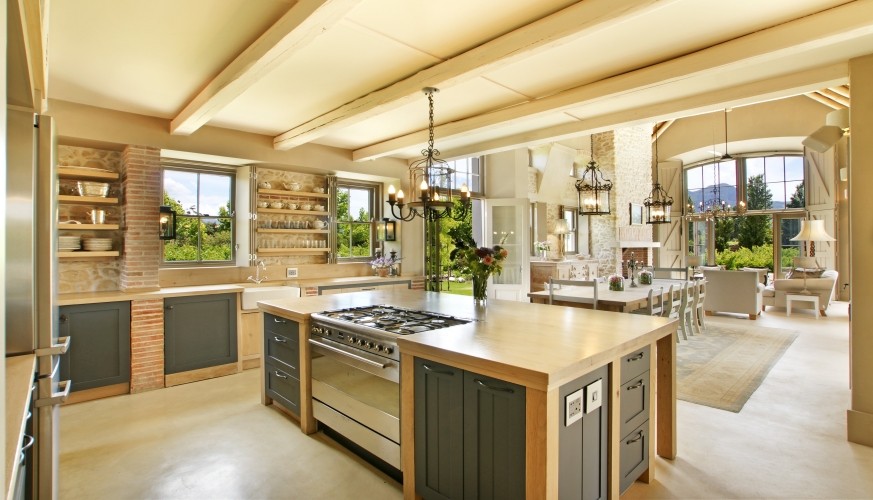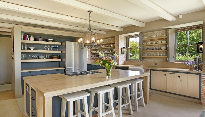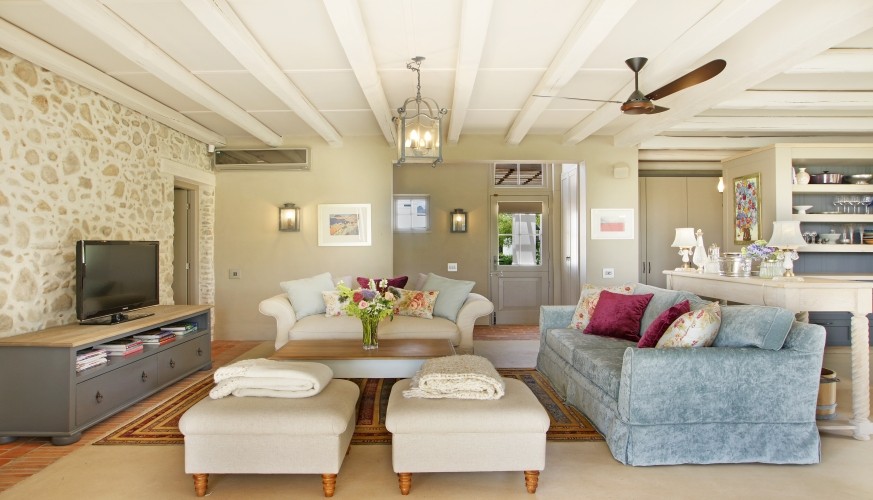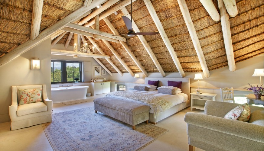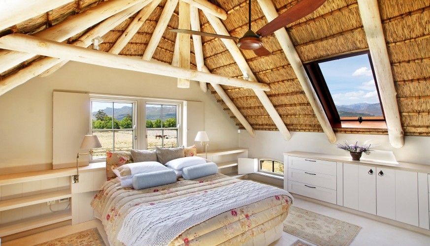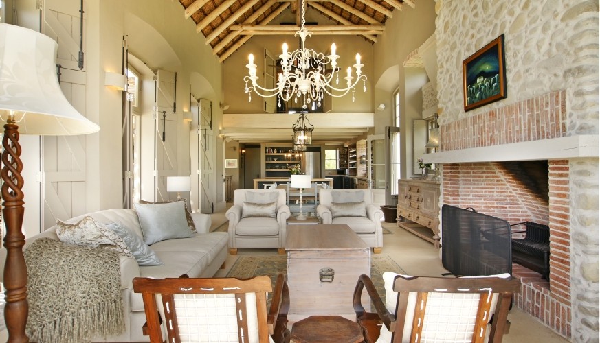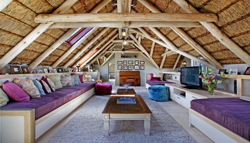 The individual design style of Cape architect Wynand Wilsenach is immediately recognizable: all the windows and doors have elegant heritage-style interior wooden shutters, klompje bricks are used decoratively – from the kitchen to the fireplace – and pebbles and stonework add character both inside and out. Lofty thatched interiors, together with fans and air conditioning make this a really cool house in the heat of summer.