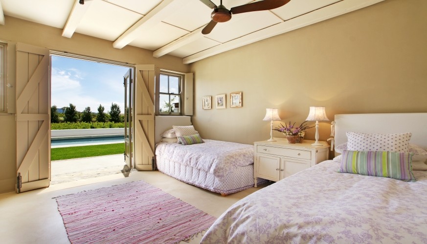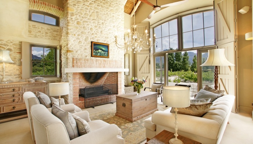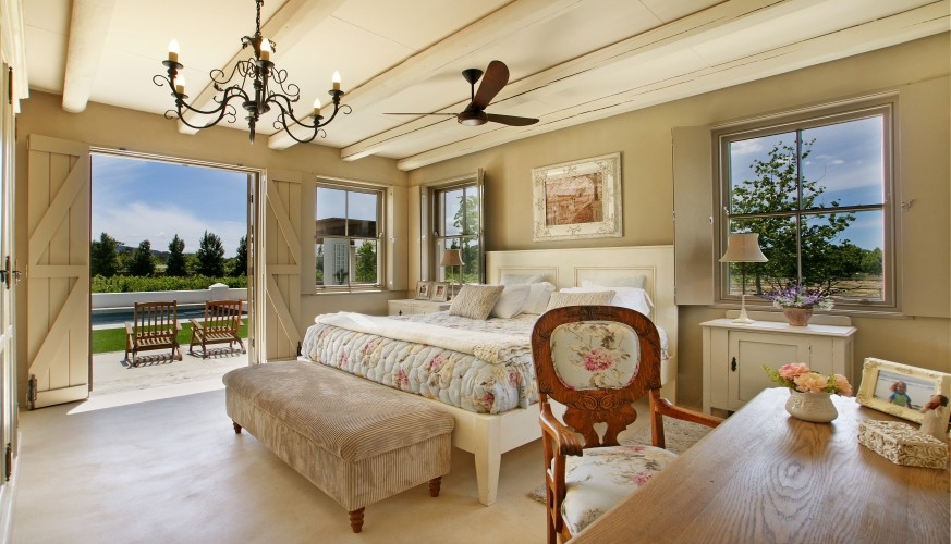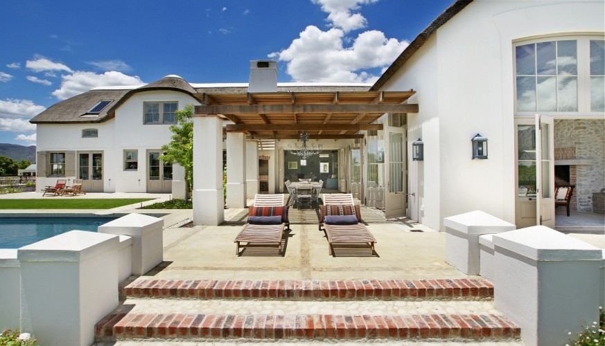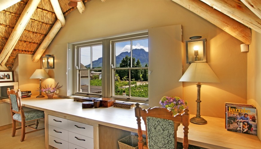 Waking to the sound of horses neighing nearby is bliss… an instant reminder that a weekend of enjoying the wine and gourmet delights of the valley is about to begin, whether it’s here – in what is a dream kitchen for cooks – or in Franschhoek itself. We found it hard to tear ourselves away from the feast of recipe books and were thrilled to discover appliances fit for a chef. This is definitely a house for all seasons: with two fireplaces indoors it’s toasty and warm in winter, while summer’s balmy breezes allow all the double doors to be opened up to the vine-covered stoep and generous-sized pool. Life here is about relaxing alfresco meals and chilling around the pool – the perfect antidote to city life or a great base for exploring the winelands.