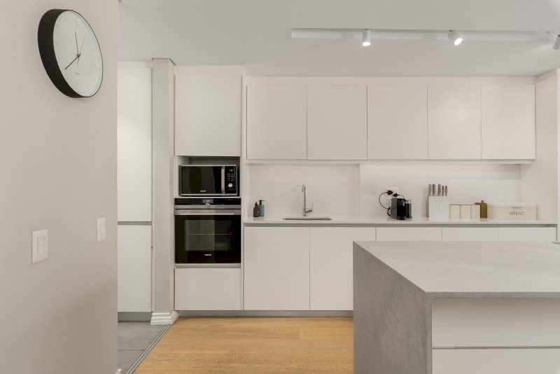 The sleek modern kitchen is fully equipped with high-end appliances and ample counter space, making it easy to prepare anything from quick breakfasts to gourmet meals. The living and dining areas flow effortlessly together, creating a sociable space for guests to enjoy.
