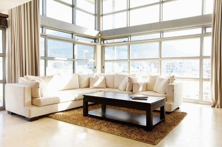 The lounge has double volume floor to ceiling windows which fill the apartment with views of the Cape Town cityscape and Table mountain. It has a large comfortable L-shaped couch and large flat screen TV. There is a also sound system and DVD player.