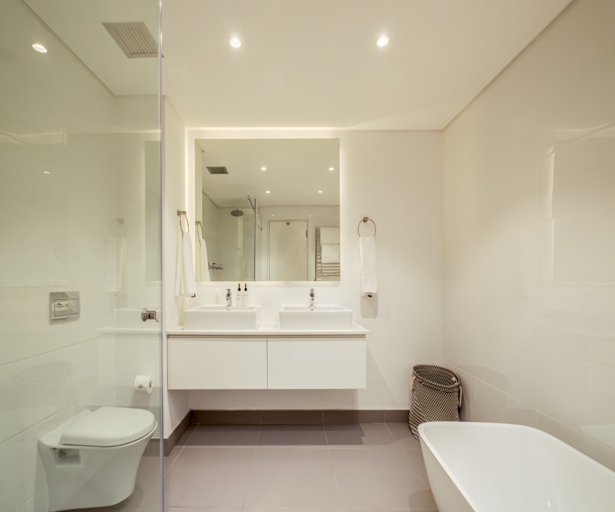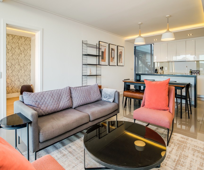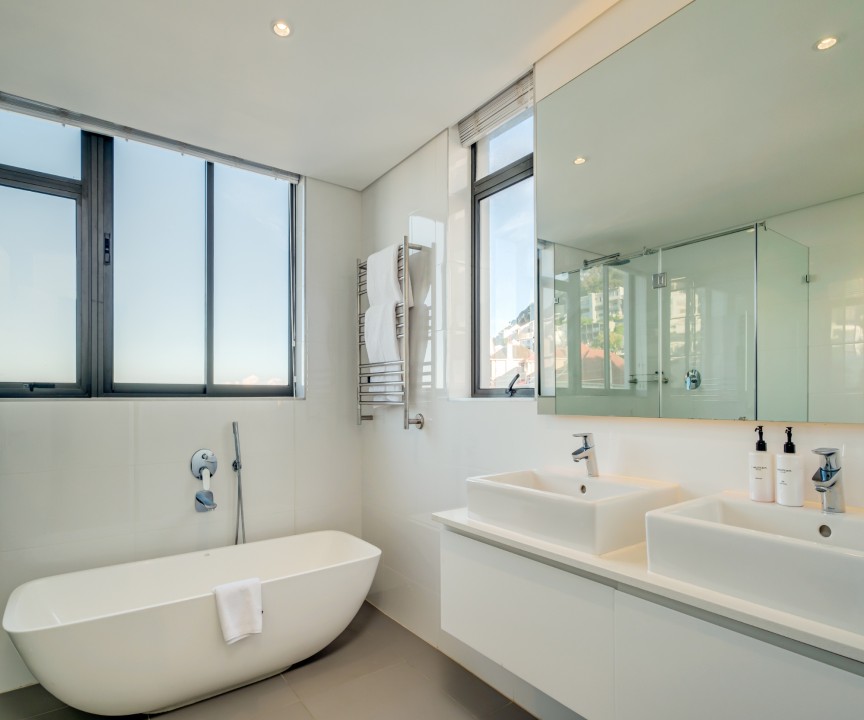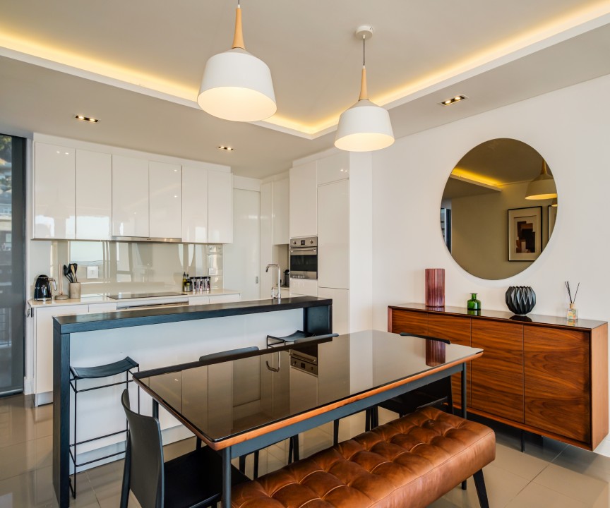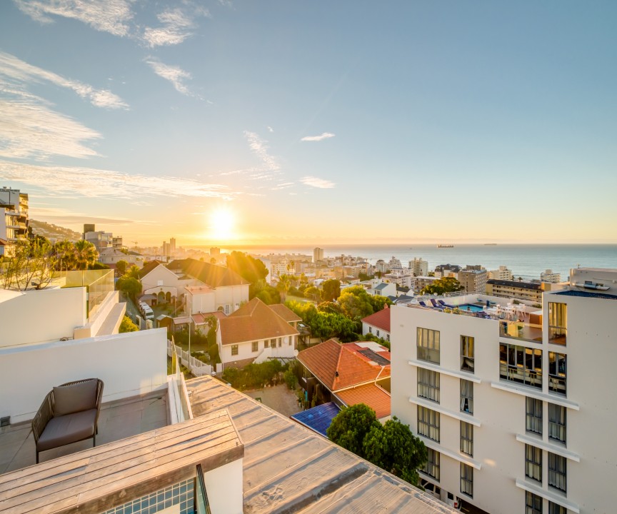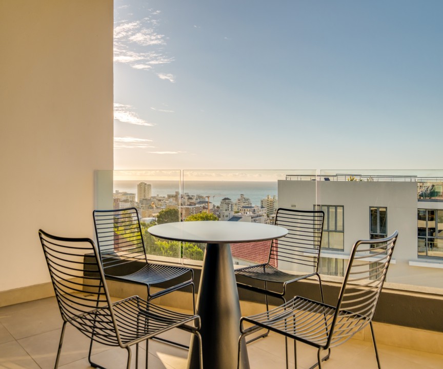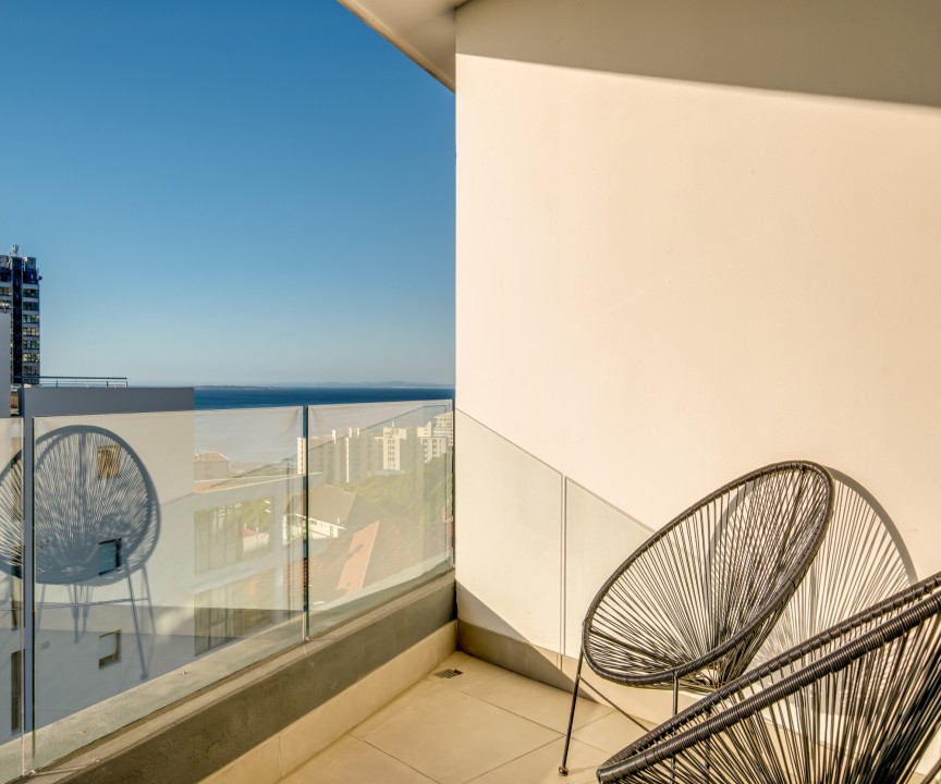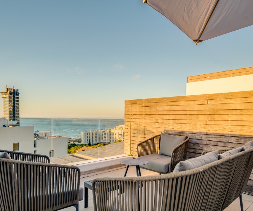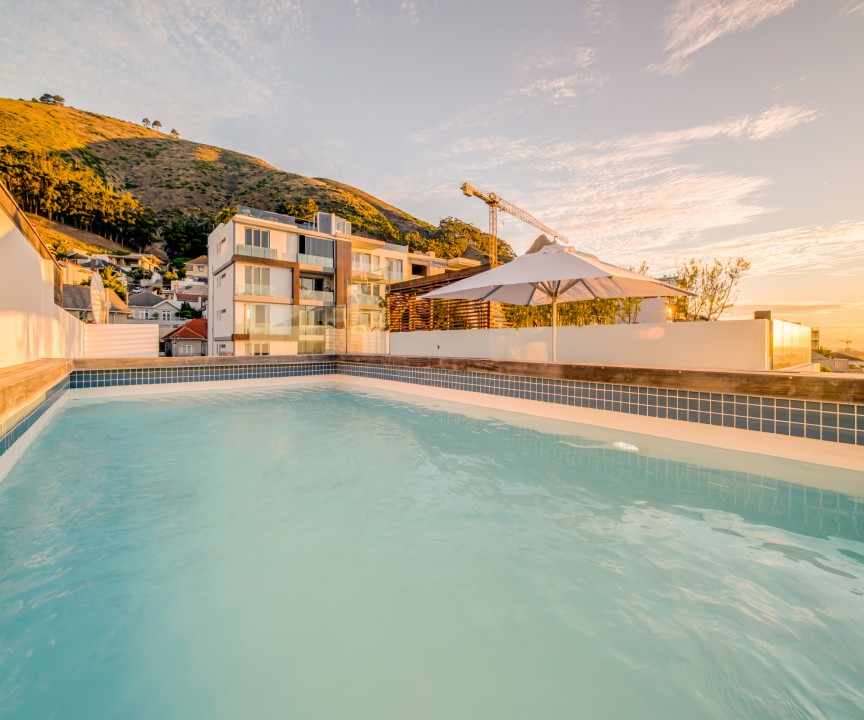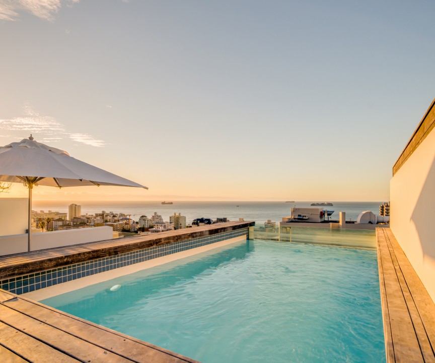 This recently completed (2018) apartment in Sea point is beautifully furnished. There are 2 well appointed and large en-suite bedrooms, one with a sea view and access to the balcony. The open plan living area and kitchen is modern and there is a separate scullery. There is a private rooftop terrace with swimming pool and exquisite views.