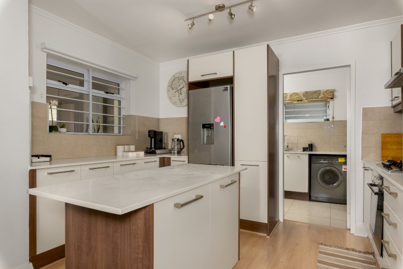 The open-plan kitchen and living area make this apartment feel bright and expansive. The kitchen is fully equipped with modern appliances, cutlery, and cookware—perfect for preparing meals at your own pace. A separate scullery adds extra convenience and keeps the main kitchen area organized.