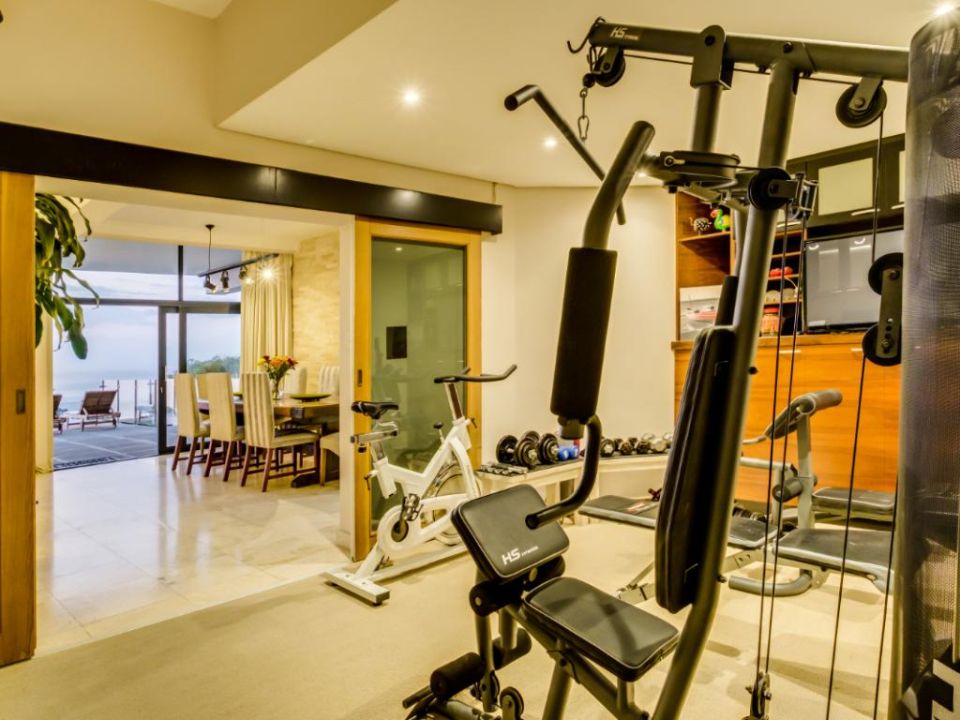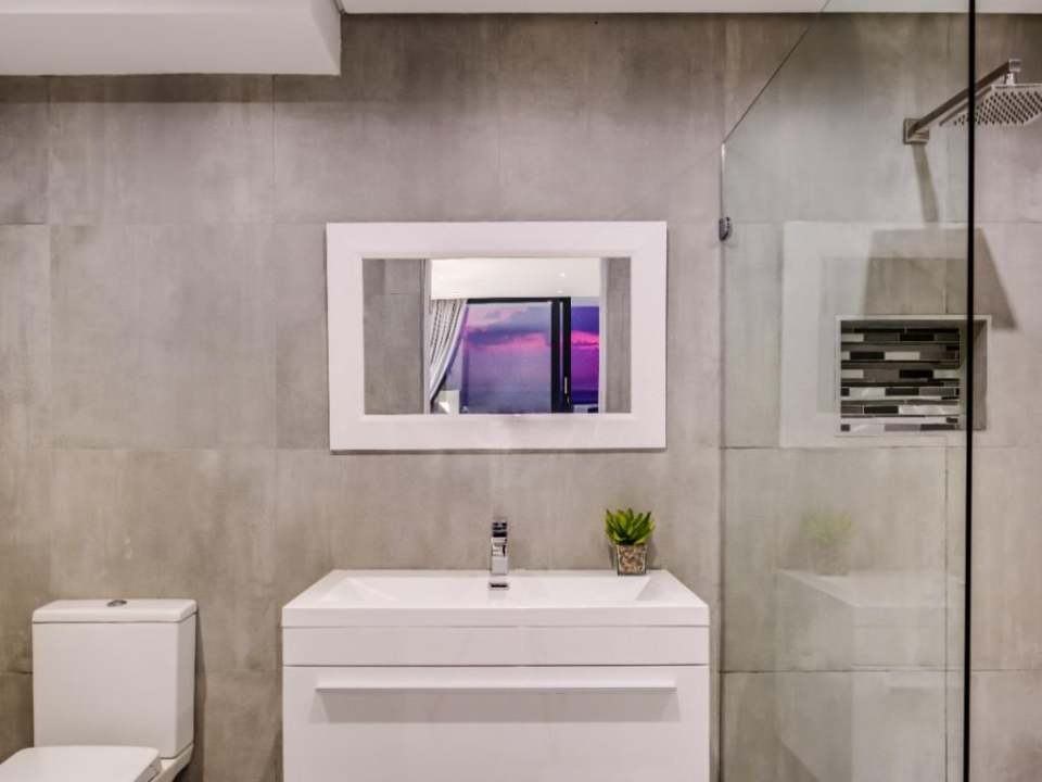 The villa accommodates seven bedrooms, including a master suite with an open-plan bathroom and ocean-facing balcony, plus a private sixth bedroom with its own entrance and kitchenette. Teenagers and children will love the seventh bedroom with a double bed, sleeper couch, and large TV, while other bedrooms feature en-suite bathrooms and private balconies with sea views.