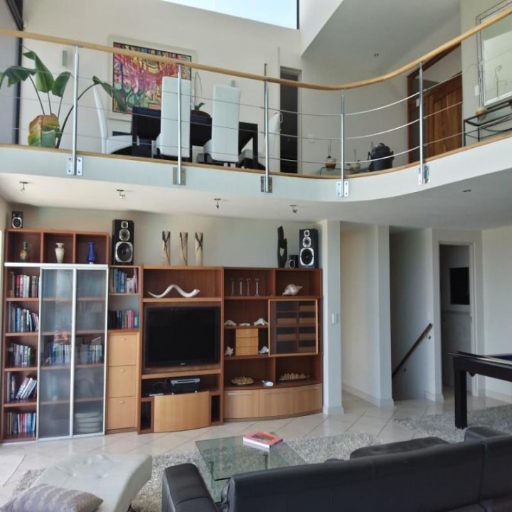 There is a separate open plan dining area with table and chairs and balcony. The middle level provides the ultimate entertainment area with an indoor bar with bar chairs, a pool table, indoor gas braai and large plasma screen with full DSTV and WIFI.