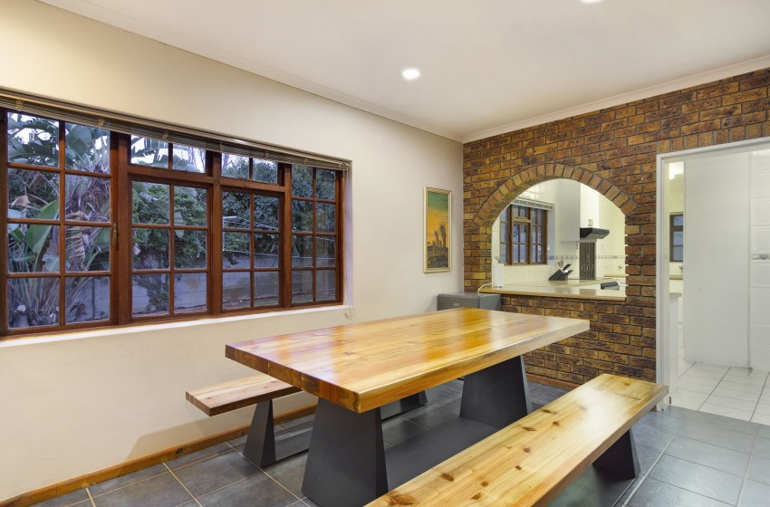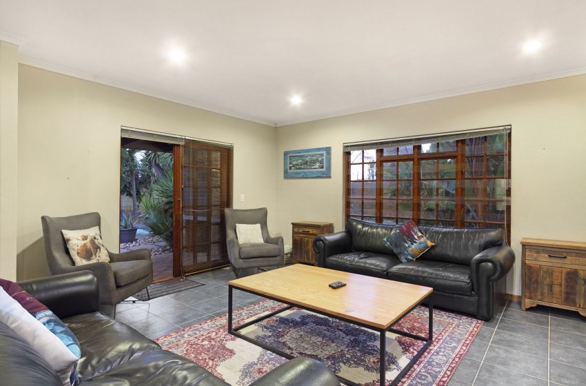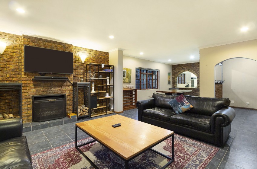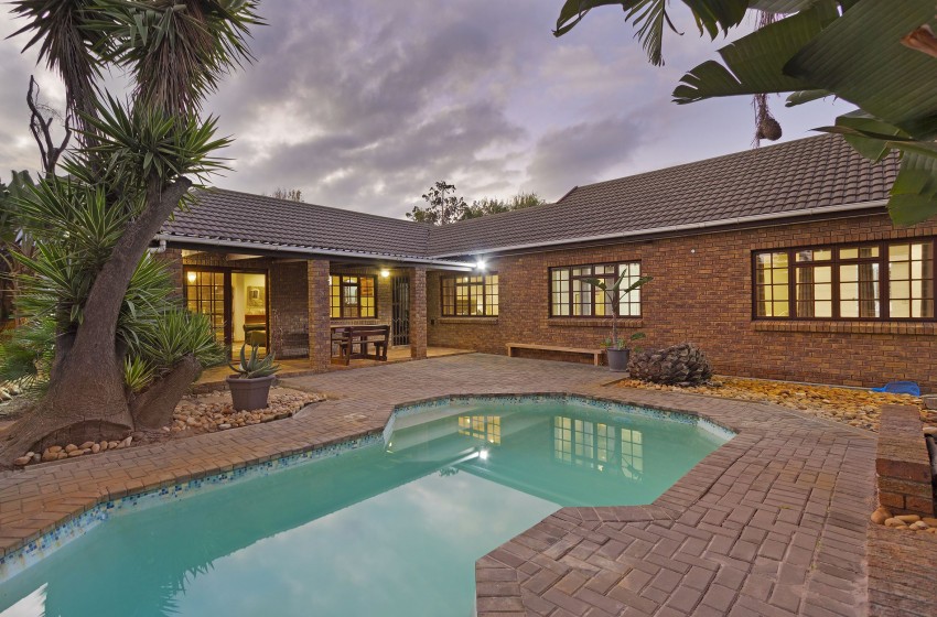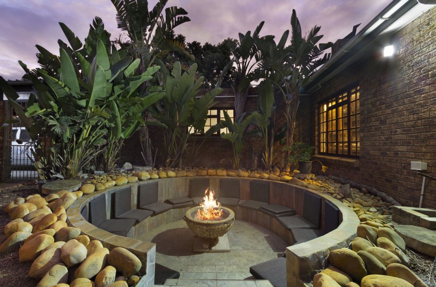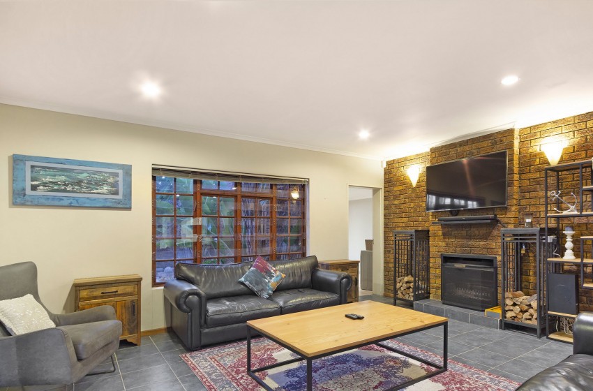 Upon arrival, you are greeted by a house that radiates warmth, making you feel right at home. The kitchen area is extensive, fully equipped to guarantee the best possible self-catering experience – with unmatched convenience following suit. The kitchen leads out to a dining area with a picnic-style bench, comfortably seating up to 6 guests. The living area is spacious, with more than enough seating to make for a suitable hub area. The indoor fireplace is guaranteed to keep you toasty while you utilize the Smart TV during those chilly evenings spent indoors. The backyard provides a tropical-style garden area with palm trees. This setting brings out the beauty of the stunning pool area, spacious lawn area and fire-pit area. Stilt Seven can function as the ultimate summer home or a perfectly cosy winter retreat.