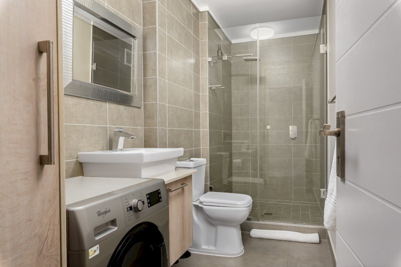 The bedroom features a comfortable double bed with ample cupboard space. The apartment comes with a separate bathroom with a free-standing shower. The building also has 24-hour security and secure parking allowing for added peace of mind.