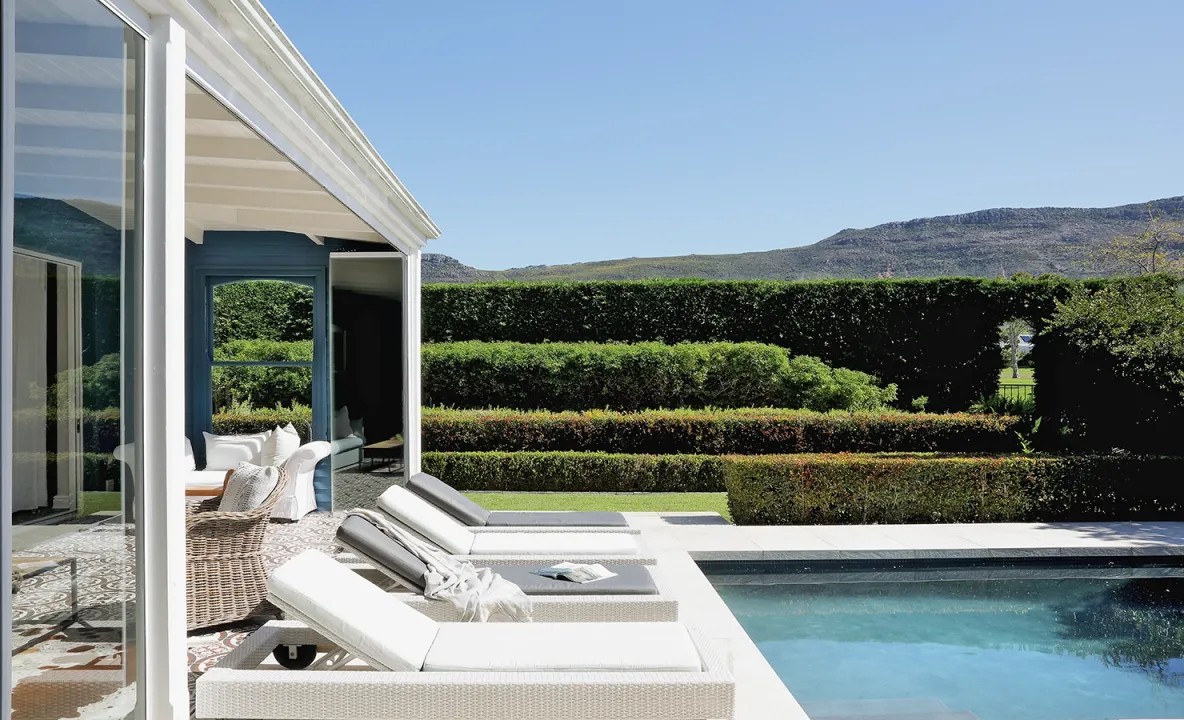 Guests have exclusive use of the villa, pool, courtyard, and terraces, with access to Steenberg Estate amenities including restaurants, golf, and spa facilities.