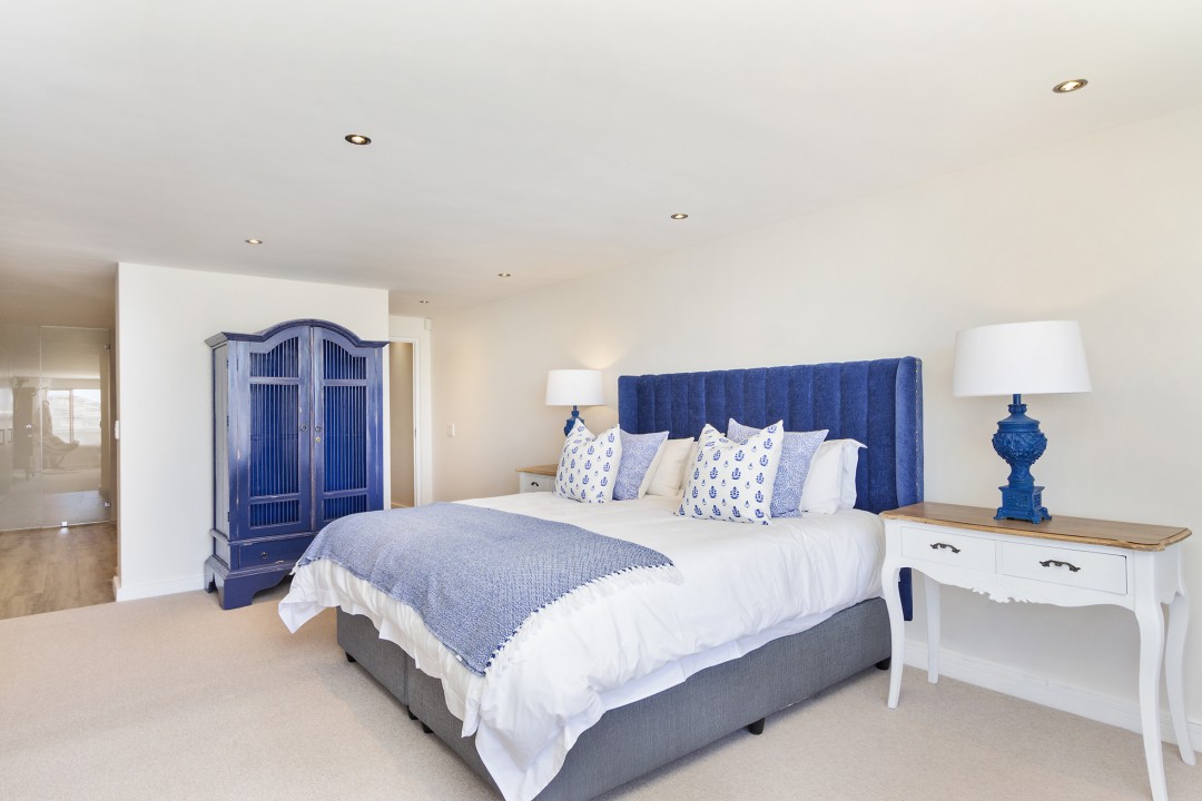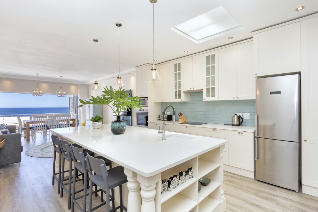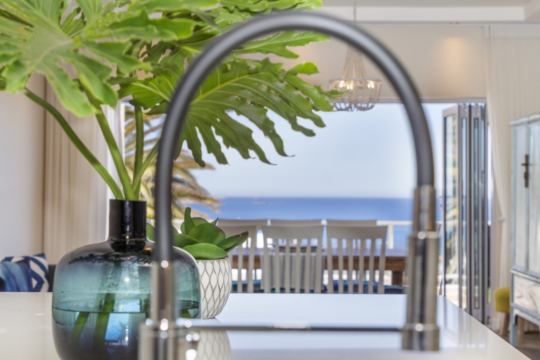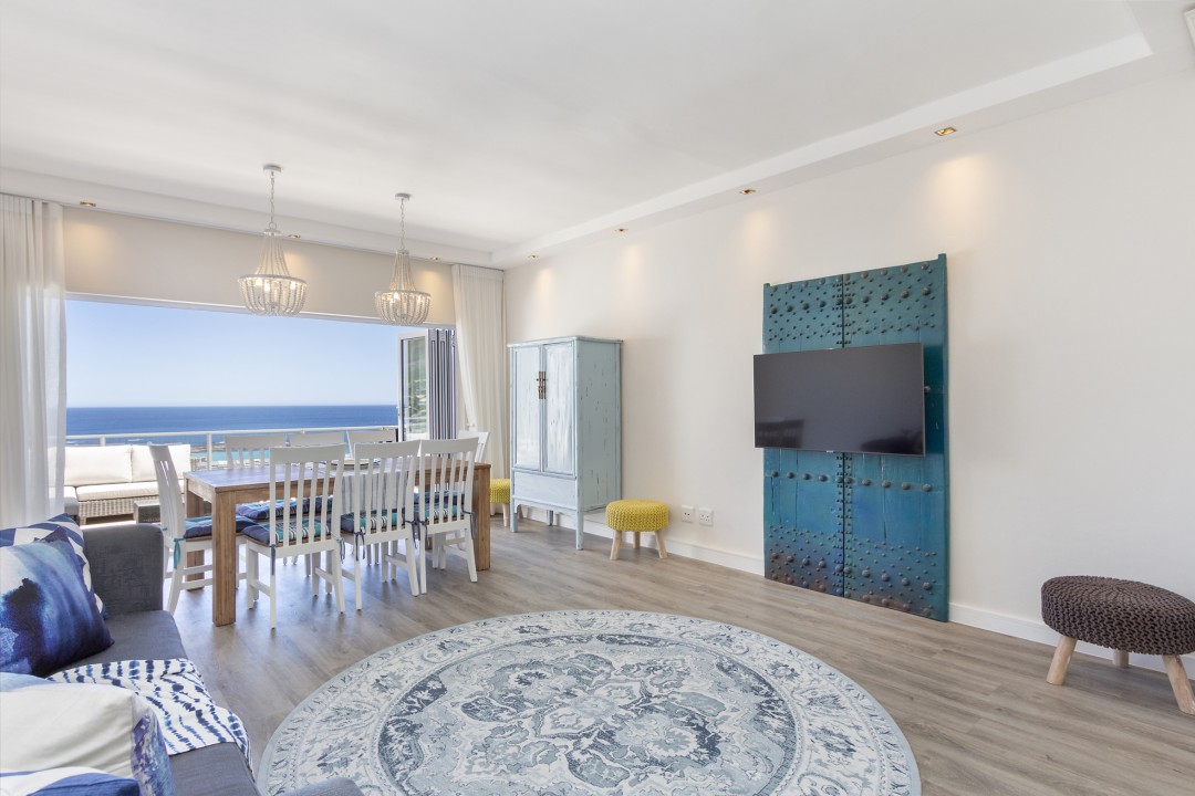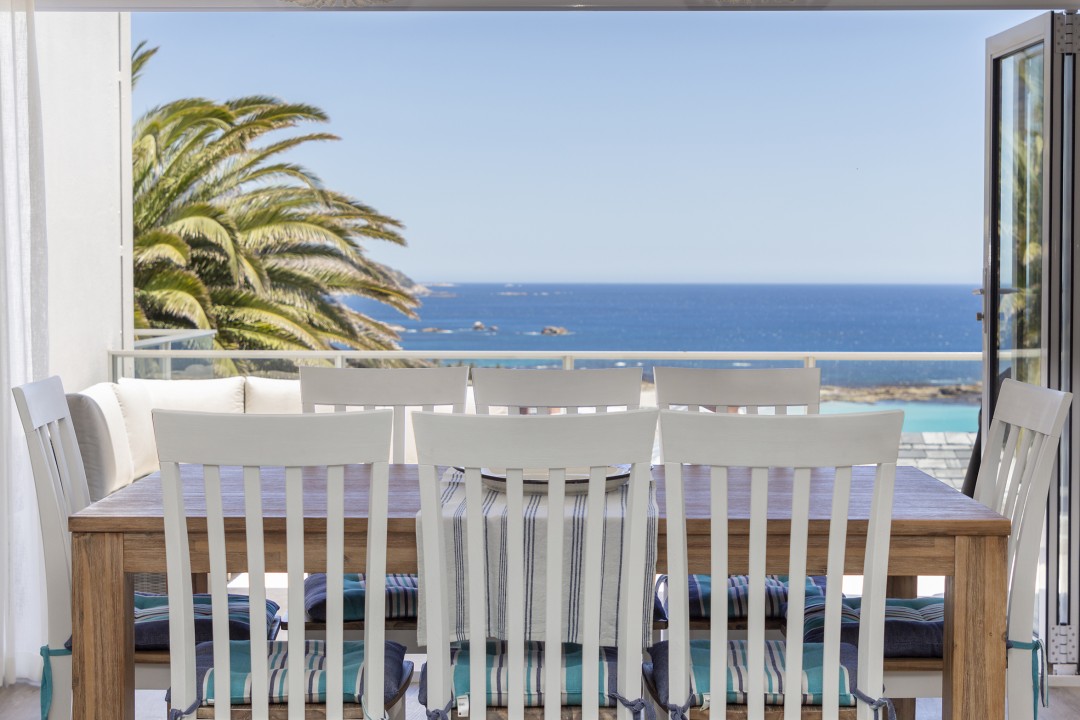 The kitchen flows seamlessly into a casual lounge area with a plush couch and flat-screen television and a dining area where an eight-seater dining table is set next to the balcony with breath-taking views of the ocean beyond. Fully retractable, concertina doors allow you to bring the ‘outside in’ so that the balcony merges with the living space.