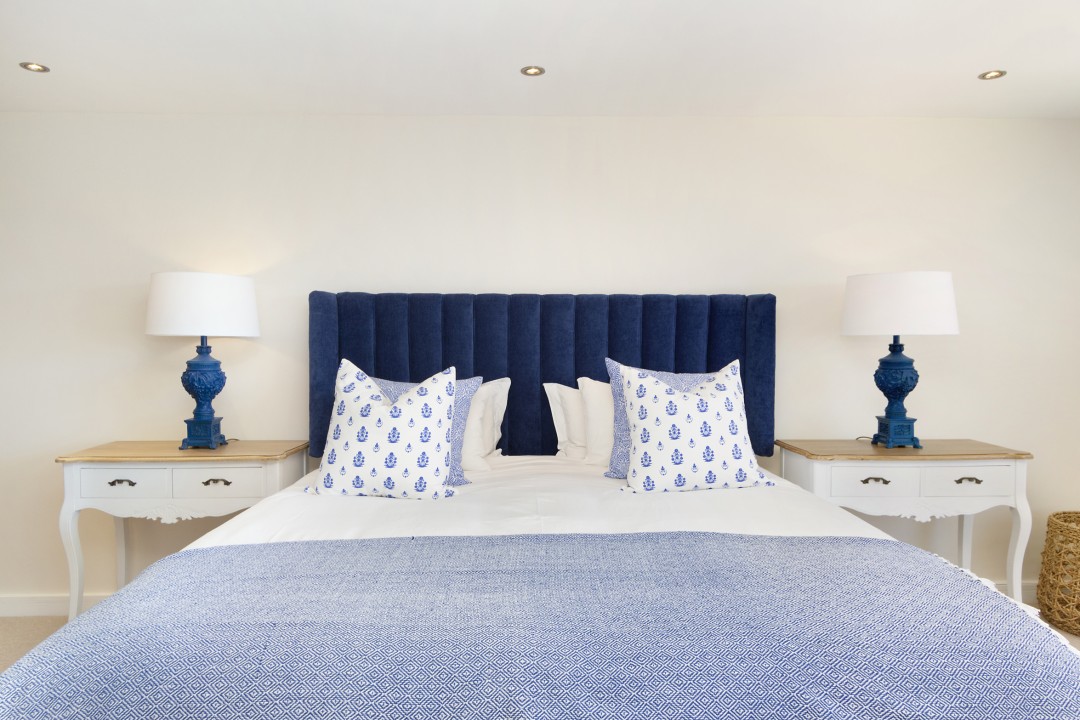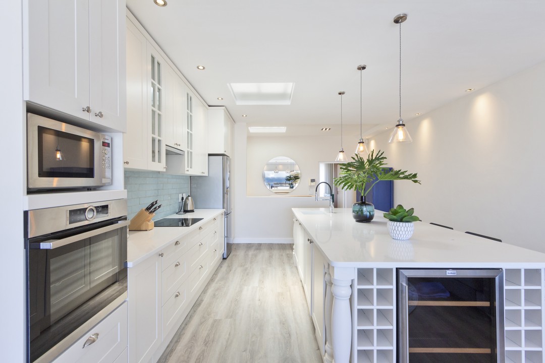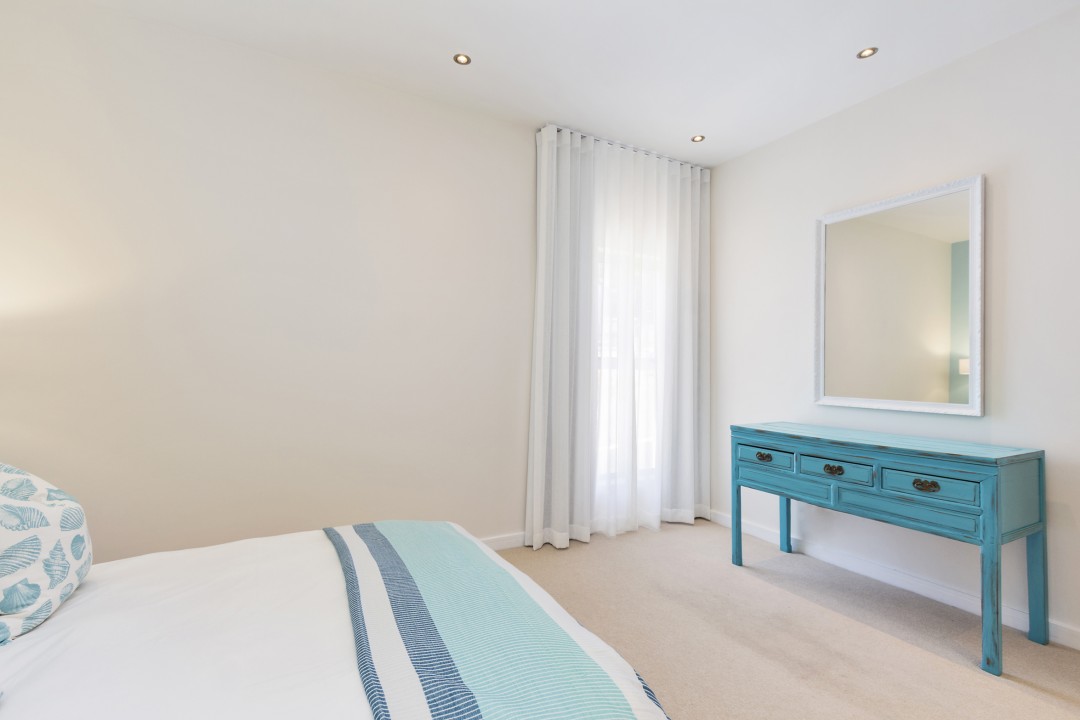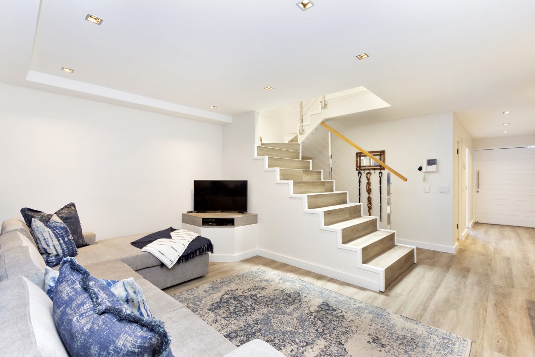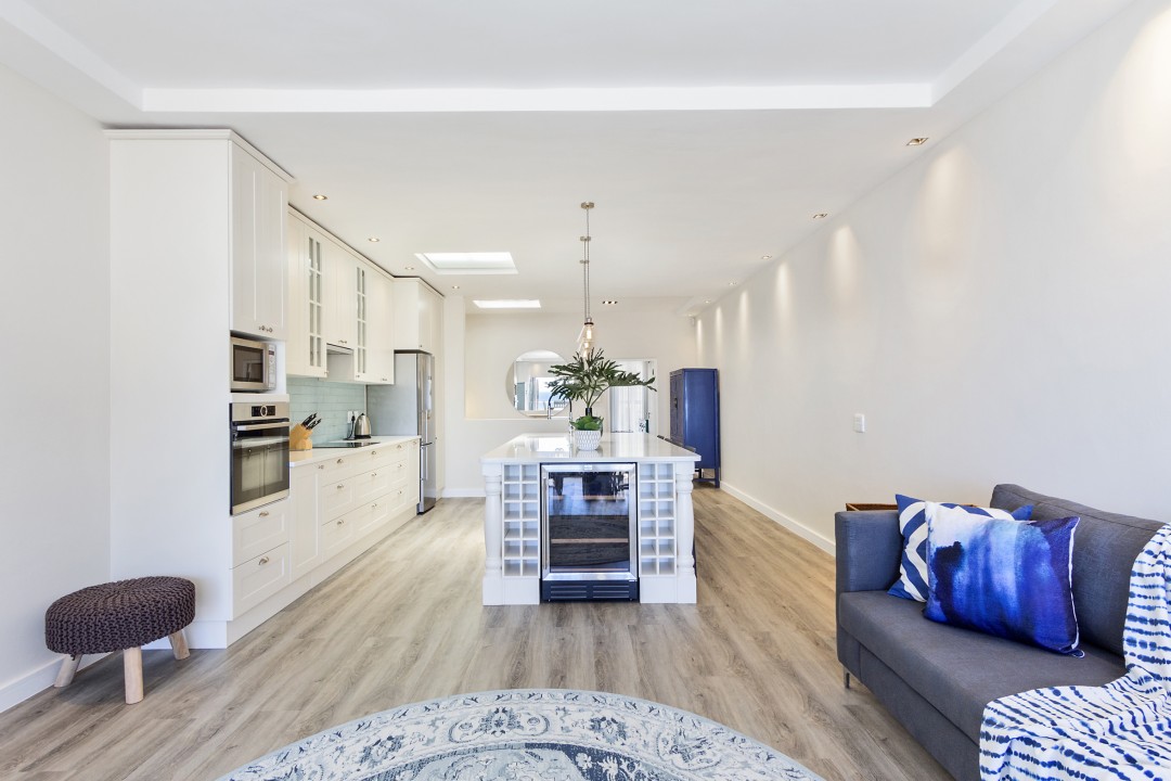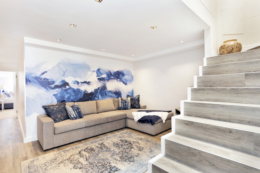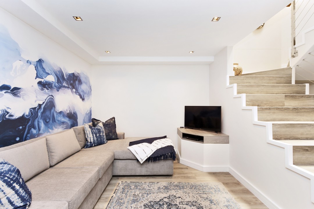 The second level of the townhouse is home to the main living areas, which are light and airy, and a third bedroom with en-suite bathroom, all decorated in cool tones of blues and greens. A modern kitchen is sleek and white with a large centre island and is fully equipped for a stress-free stay with an oven, stove, microwave, a fridge/freezer, wine fridge and ice-maker. Stylish stools along one side of the island provide seating to be enjoyed as a breakfast nook or bar counter.