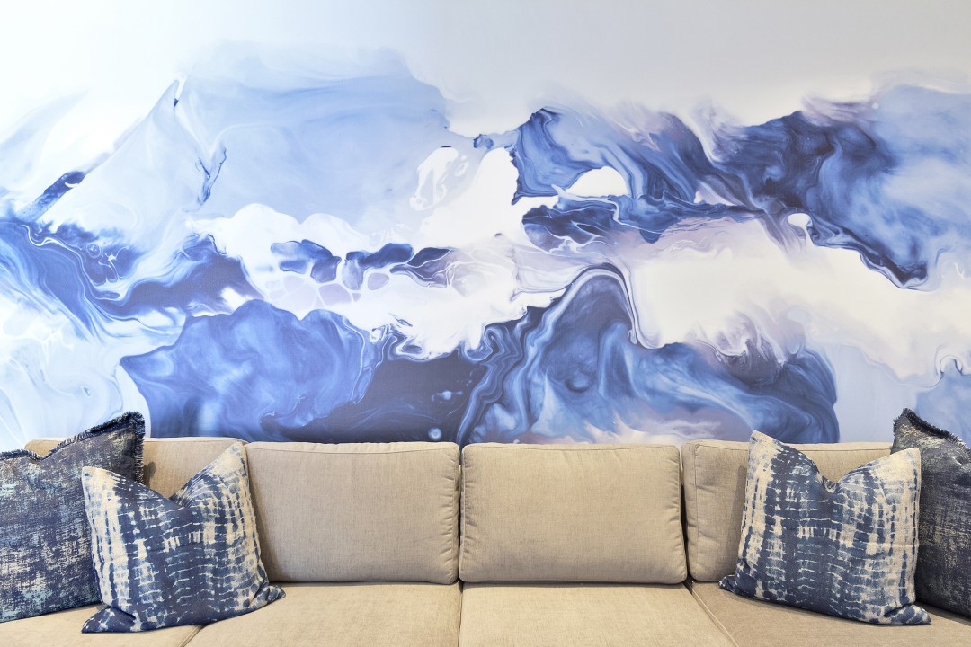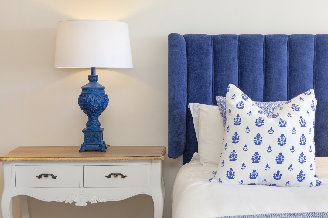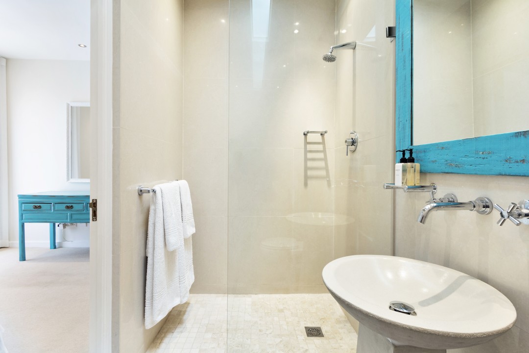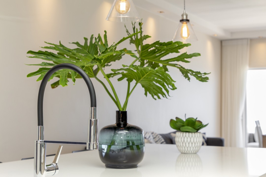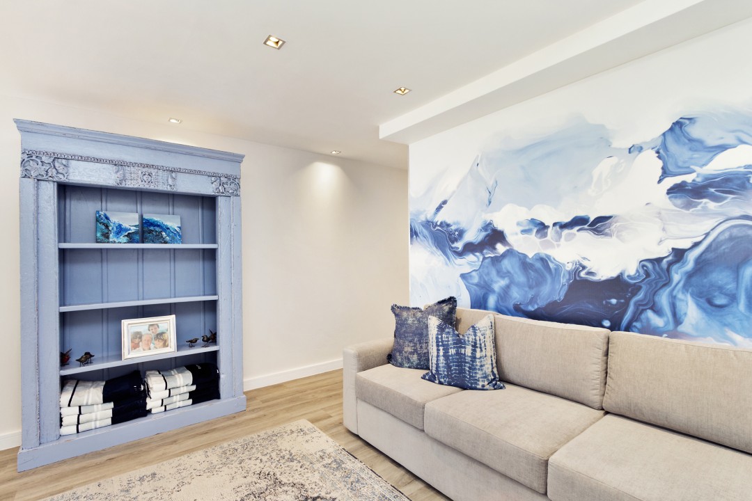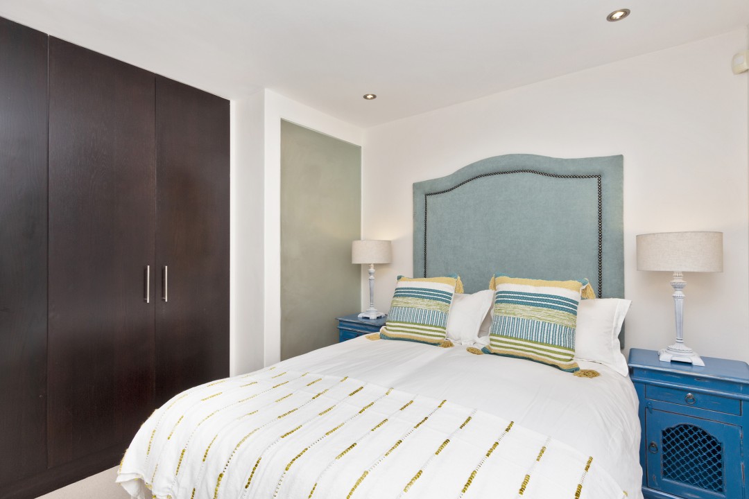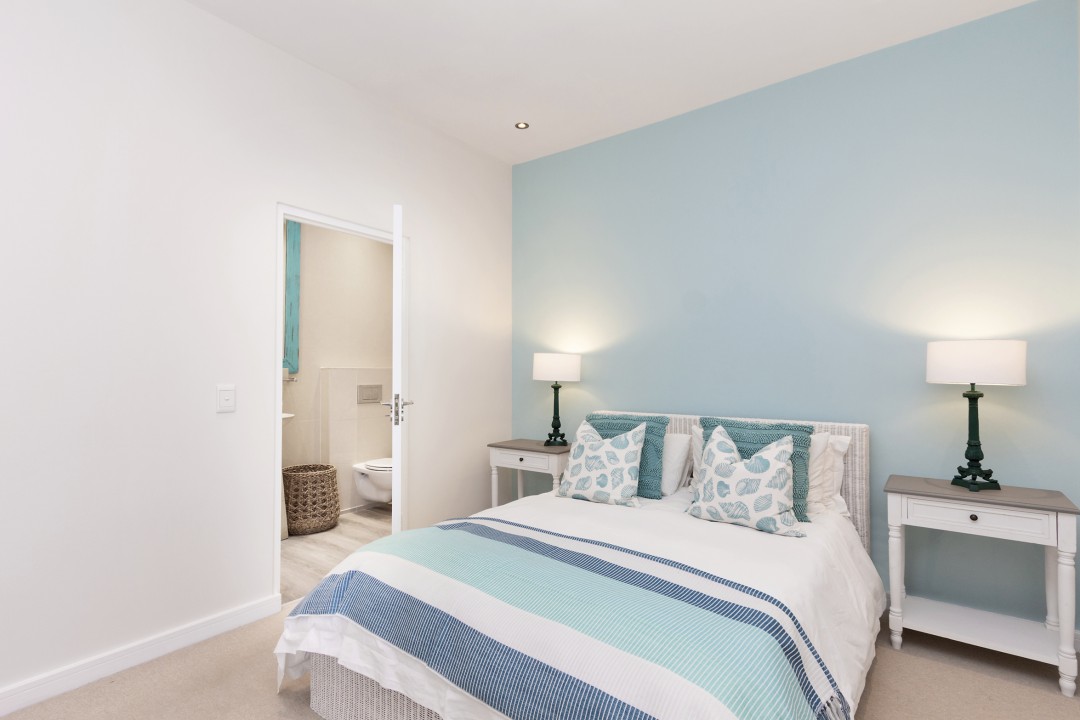 The second level of the townhouse is home to the main living areas, which are light and airy, and a third bedroom with en-suite bathroom, all decorated in cool tones of blues and greens. A modern kitchen is sleek and white with a large centre island and is fully equipped for a stress-free stay with an oven, stove, microwave, a fridge/freezer, wine fridge and ice-maker. Stylish stools along one side of the island provide seating to be enjoyed as a breakfast nook or bar counter.