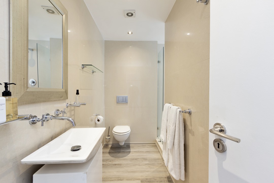 A stylishly decorated and spacious master bedroom is also located on this level of the townhouse and enjoys gorgeous views from large sliding windows, which flood the room with natural light. The master bedroom has an ample walk-through closet area with plenty of cupboard space, and a large en-suite bathroom with a rain shower, a bathtub, and an enclosed toilet and bidet.