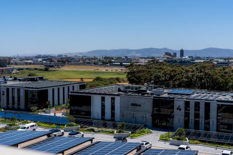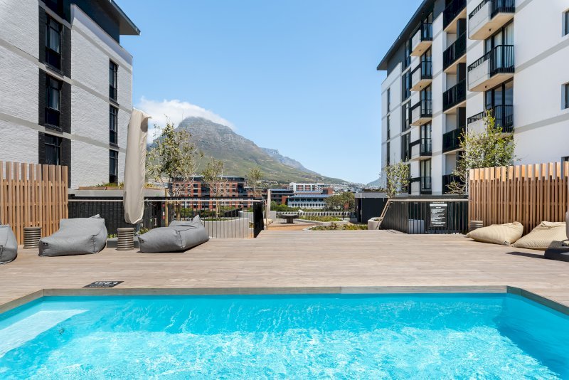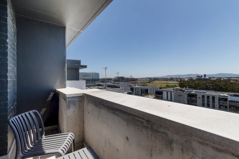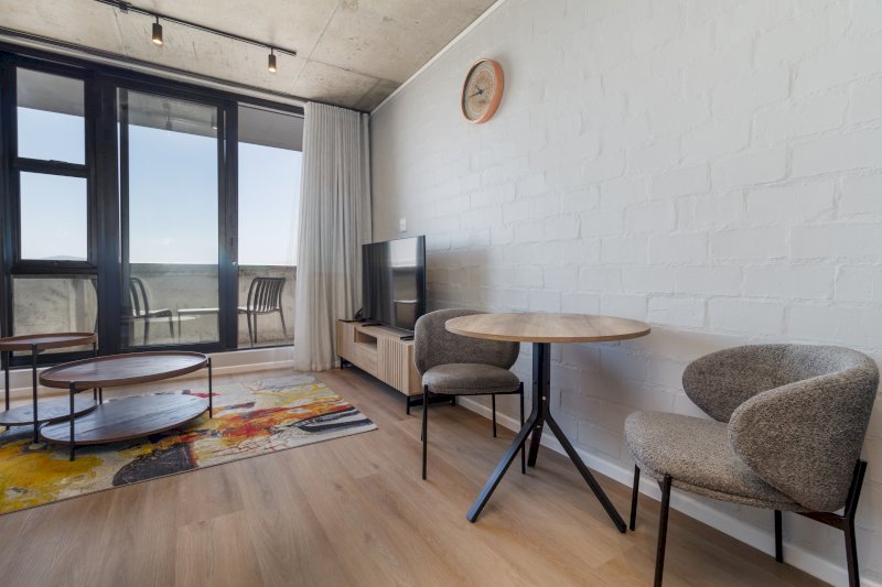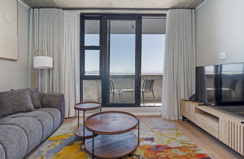 The open-plan living area offers a dining table for two and a comfortable lounge with a smart TV, perfect for cozy evenings in. Sliding doors lead to a private balcony where you can unwind and take in the beautiful views of the Helderberg Mountain range.