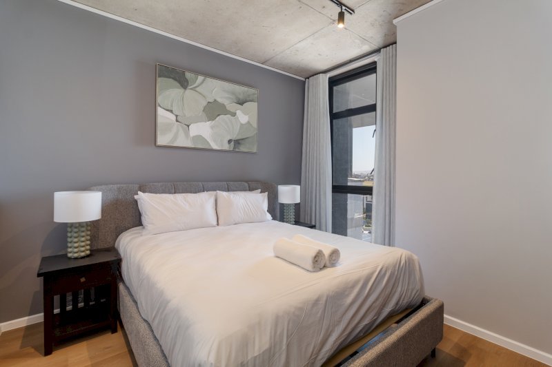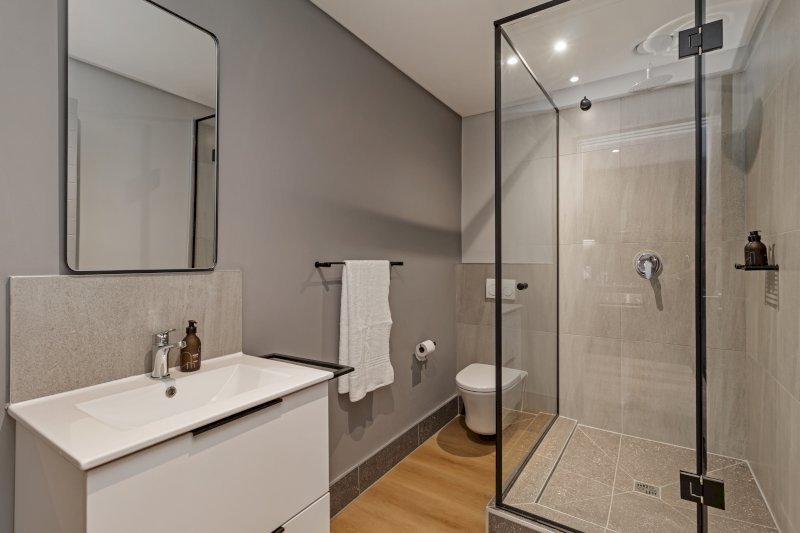 The bedroom features a plush queen-sized bed and generous cupboard space, ensuring a restful and organised stay. Adjacent to the bedroom, the spacious modern bathroom boasts a sleek walk-in shower and contemporary finishes.