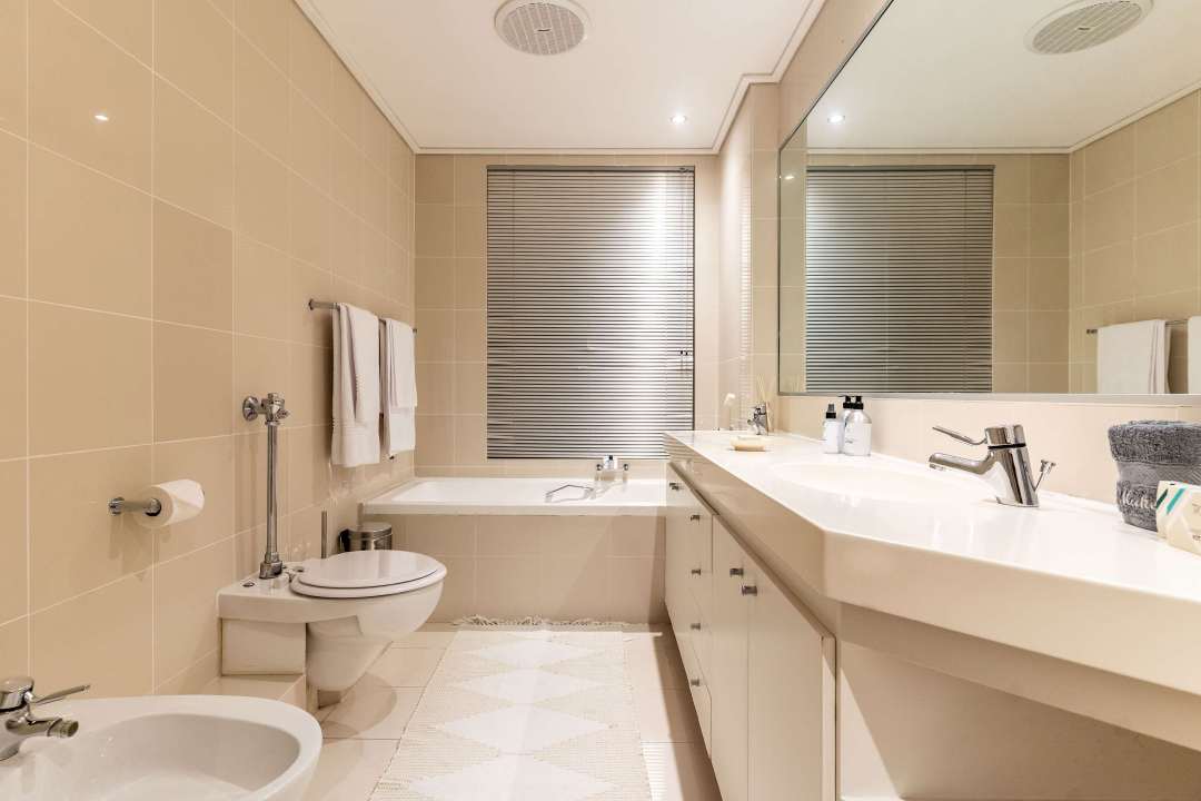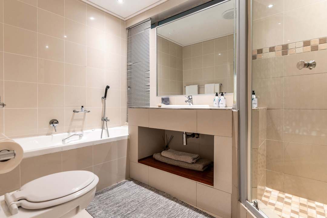 The apartment comfortably accommodates up to six guests across three well-appointed bedrooms. The master suite includes a king-size bed, ample cupboard space, air conditioning, and a luxurious en-suite bathroom with both a shower and bath. The second bedroom, also ocean-facing, features a queen-size bed, while the third bedroom offers twin beds. A second full bathroom is shared between the latter two rooms, and a separate guest toilet adds convenience.