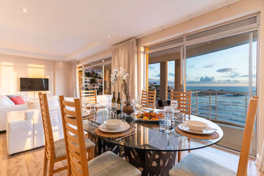 Designed for relaxation and effortless living, the apartment features a spacious open-plan layout that seamlessly connects the fully equipped kitchen, dining area, and lounge to a wide terrace overlooking the sea. Whether you’re enjoying a sunset dinner at the outdoor table or unwinding in the lounge with the sliding doors open to the ocean breeze, every moment here is framed by the beauty of Camps Bay’s coastline.