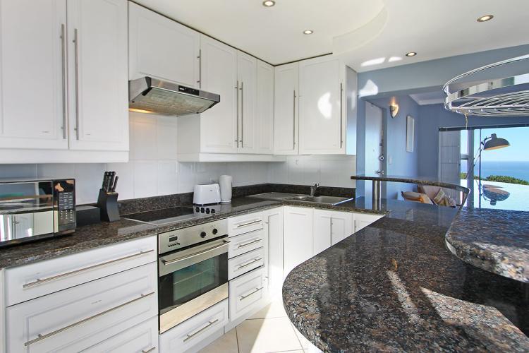 The kitchen faces out on the dining room area, which offers seating for up to four guests. Gorgeous black marble counter tops line the breakfast bar and beautifully contrast against the white cupboards and contemporary kitchen appliances.