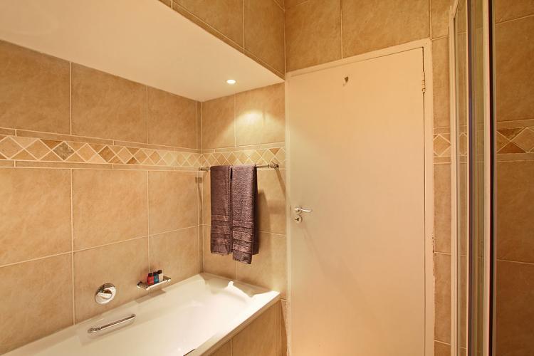 The bedroom is set behind the dining area and features a queen size bed, ample cupboard space and a safe for personal belongings. The bathroom leads off the living room and has a bath and separate shower.