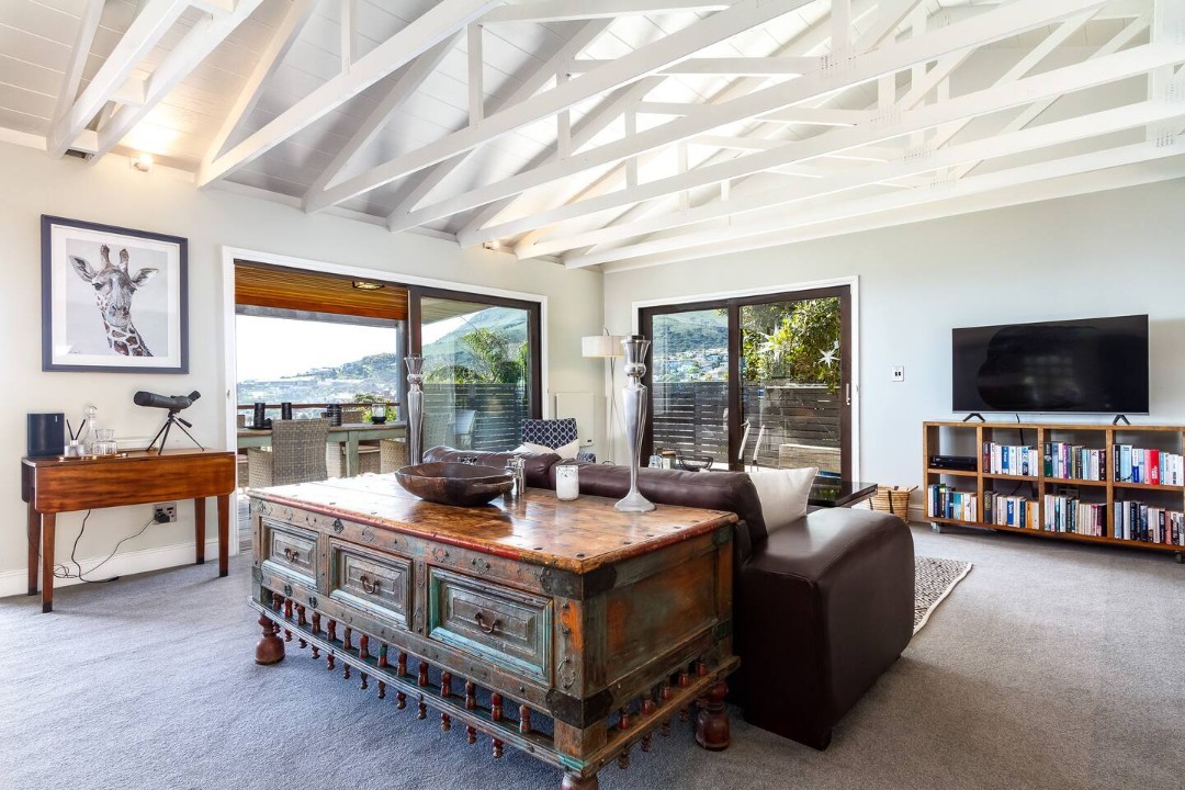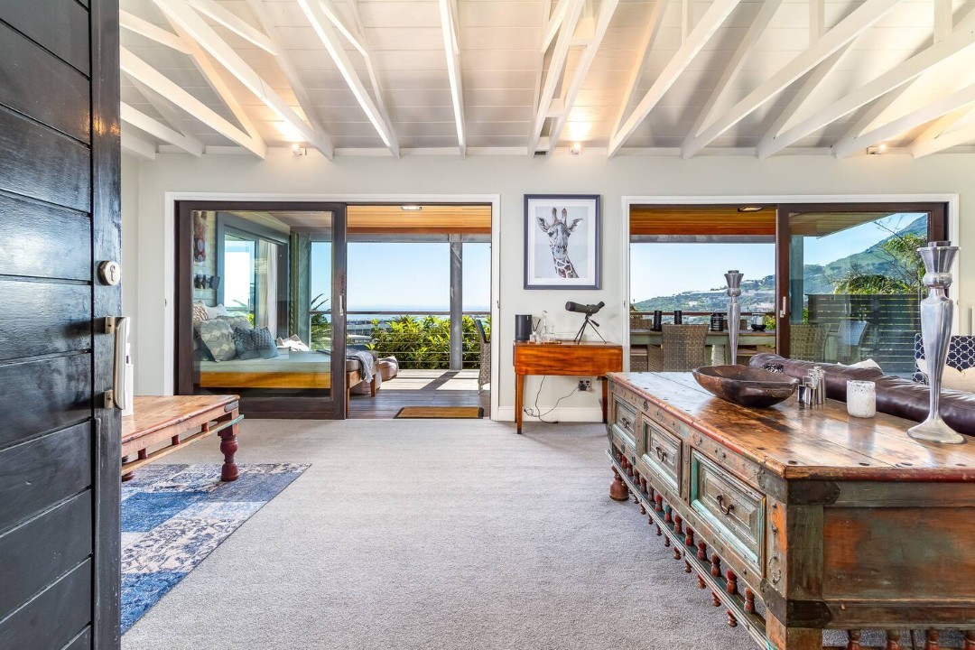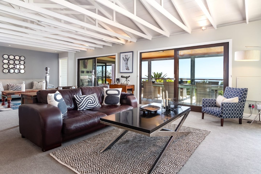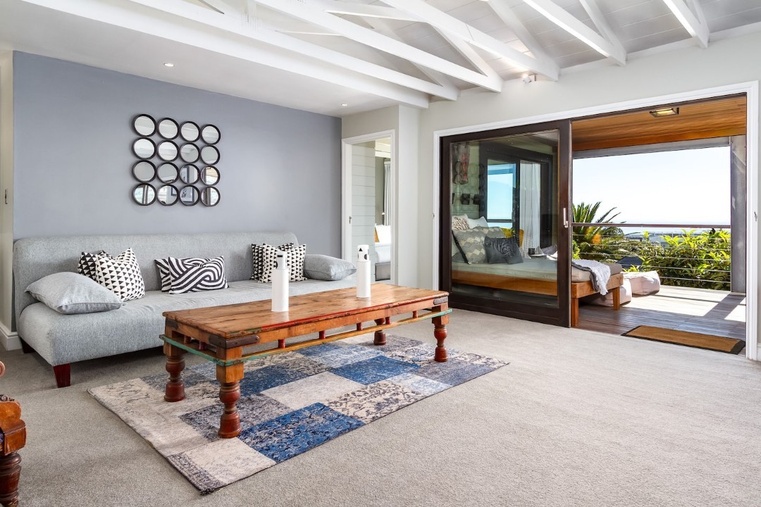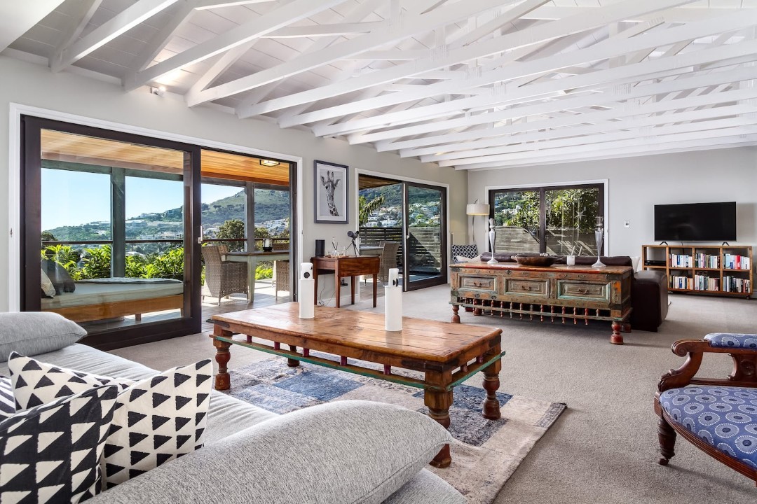 The interior is bright and welcoming, centred around a magnificent open-plan living area with vaulted ceilings and expansive windows, allowing natural light to pour in while framing views of the Atlantic Ocean and Lion’s Head.