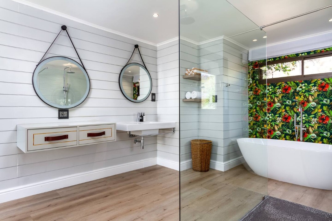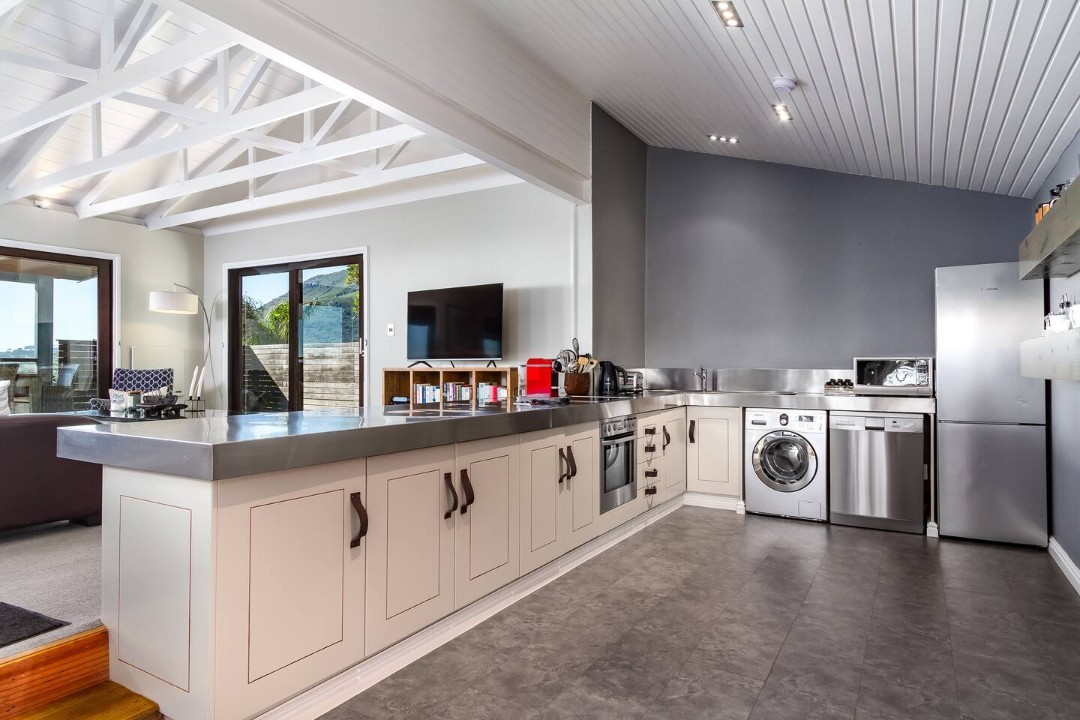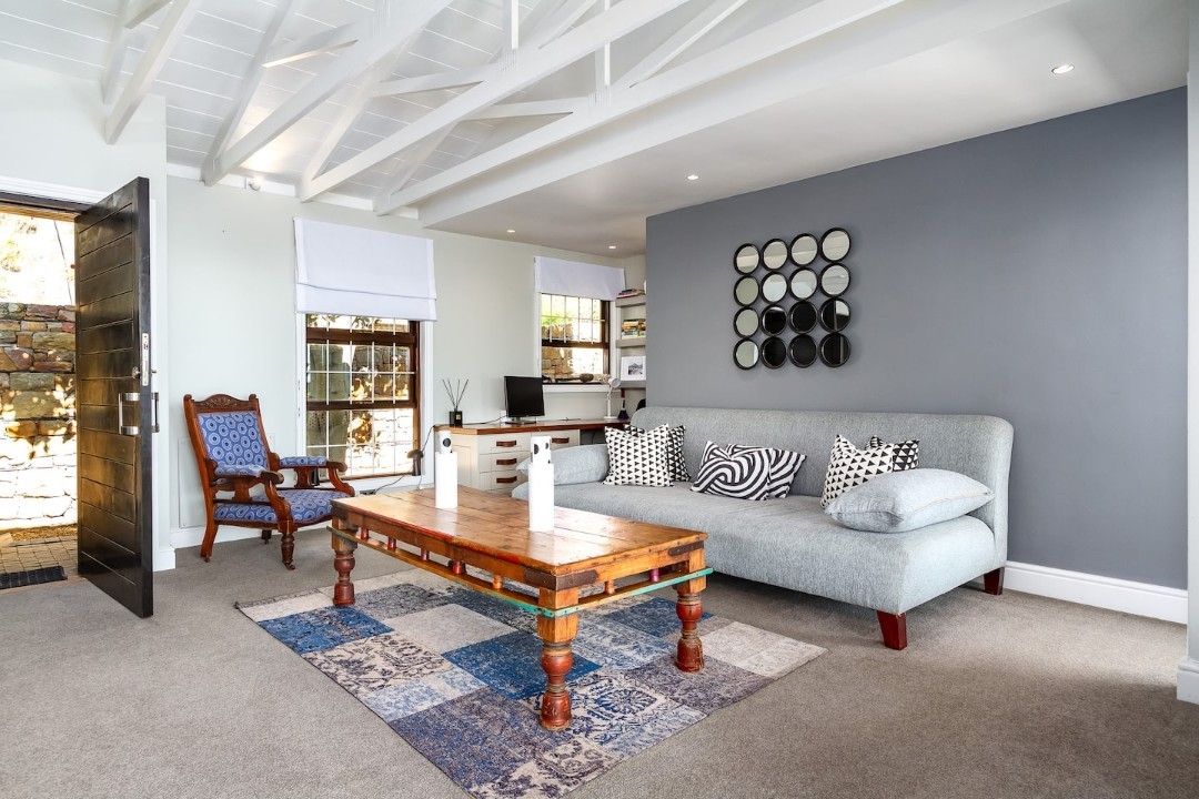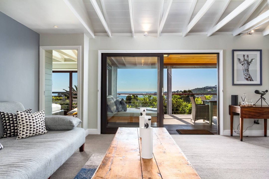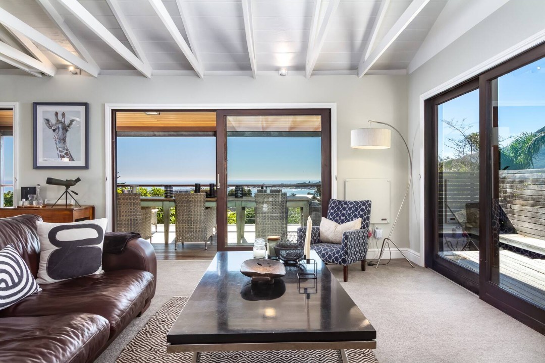 The interior is bright and welcoming, centred around a magnificent open-plan living area with vaulted ceilings and expansive windows, allowing natural light to pour in while framing views of the Atlantic Ocean and Lion’s Head.