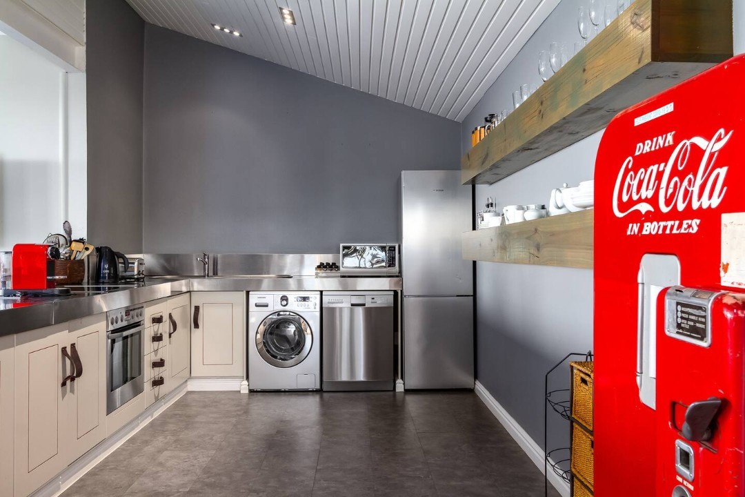 The apartment offers two comfortable lounge areas, perfect for relaxing after a day exploring Cape Town. The living room features a flat-screen satellite TV, stylish furnishings, and a fully equipped modern kitchen with sleek chrome finishes and a breakfast bar.