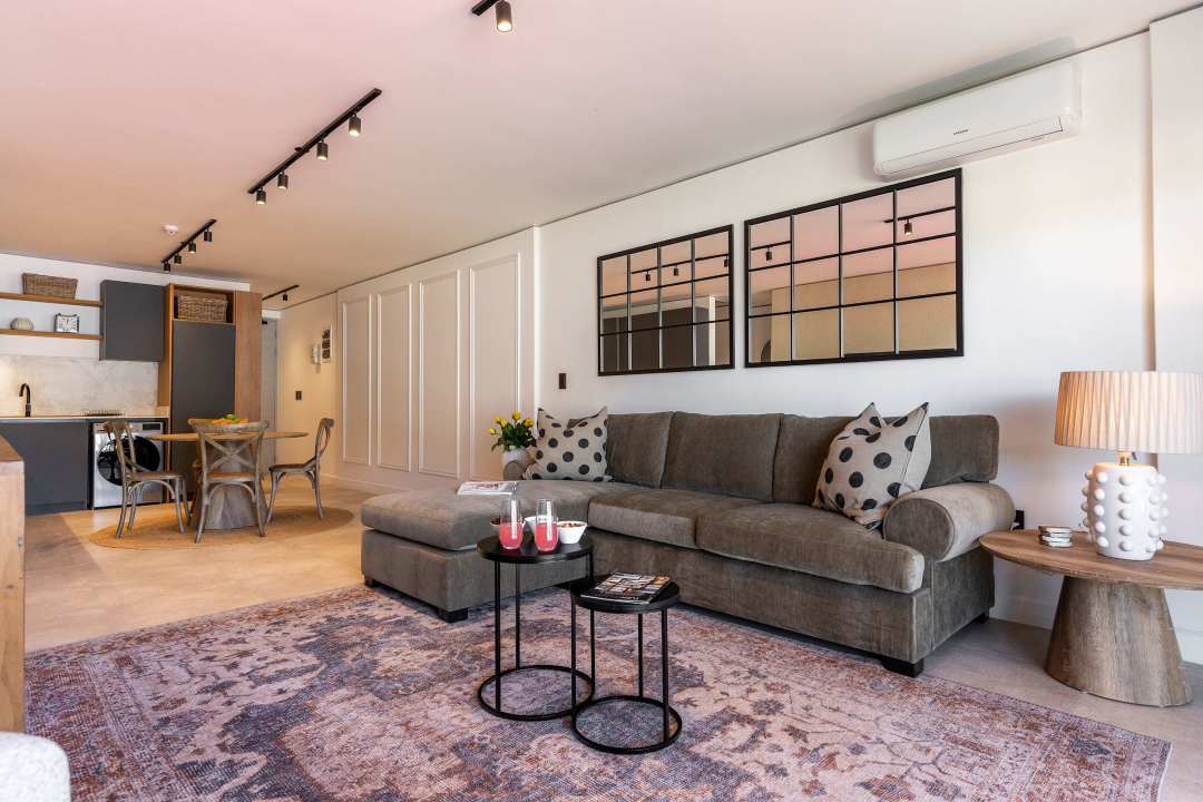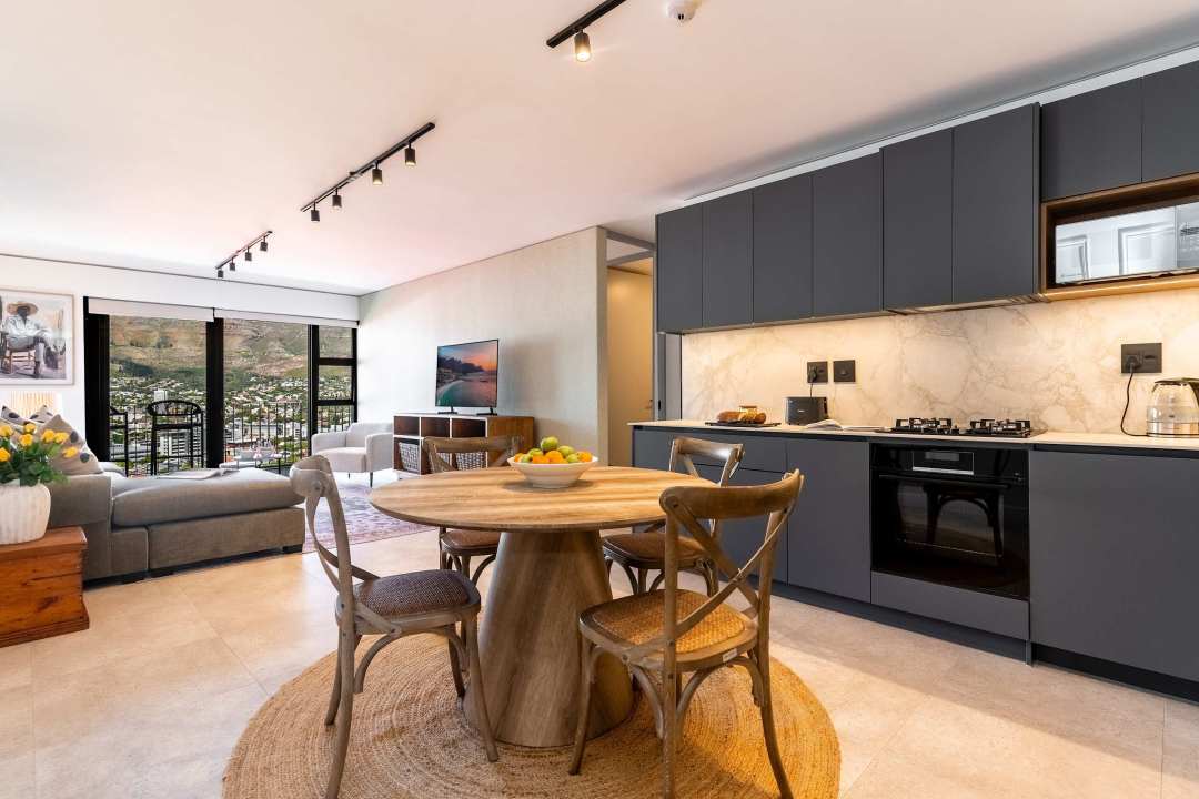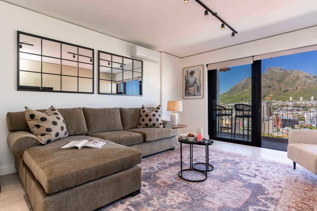 Start your day with breathtaking views from the private balcony — Table Mountain rising majestically above the skyline, a view that never gets old. The open-plan living area is flooded with natural light, creating a warm and welcoming space to relax, entertain, or simply soak in the atmosphere.